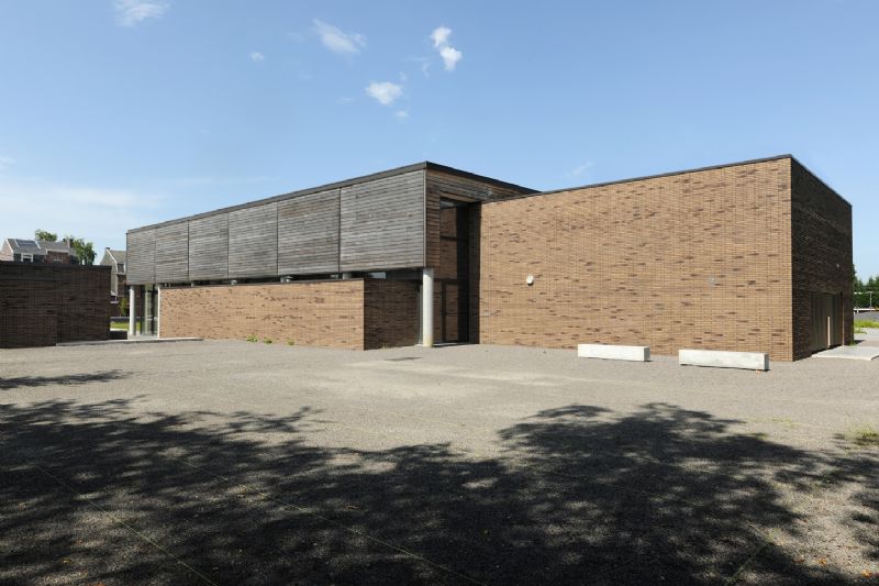 L’utilisation de plusieurs matériaux permet une " lecture" claire des différents espaces de la salle polyvalente. La partie centrale est composée d’une structure portante en béton et d’un parement en brique, matériau caractéristique du village. Une seconde structure enveloppe l’espace central pour englober les zones d’accueil et de services. Cette seconde peau est couverte de bardage en bois et pose sur des colonnes de façon à laisser pénétrer la lumière dans la salle.