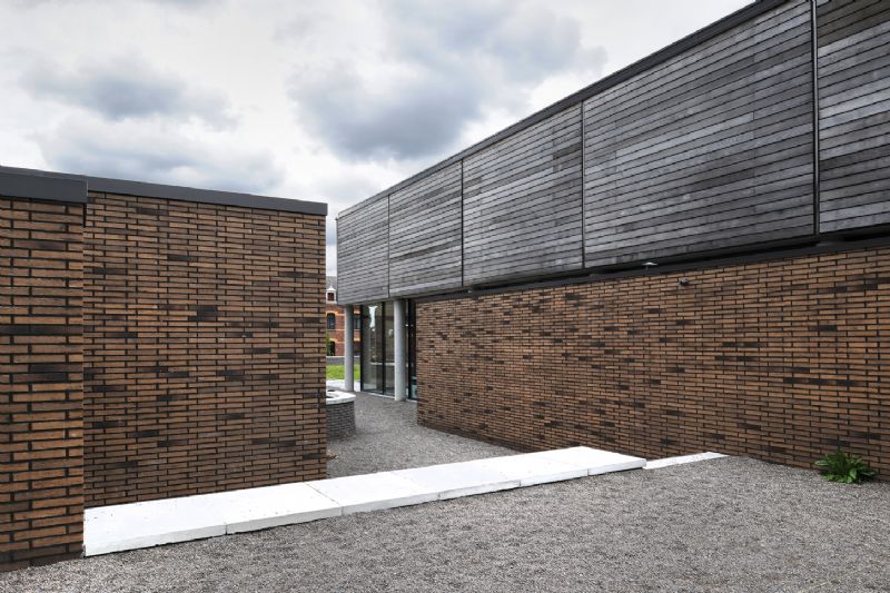 Dès la phase d’assainissement du site, les architectes ont modelé le relief pour y créer différents plateaux délimités par des murs de soutènement en gabion. La scénographie extérieure est un élément fort du projet : il se crée un parvis délimité par des murets de briques grises devant la salle polyvalente, une promenade entre les différents plateaux, des ambiances différentes.