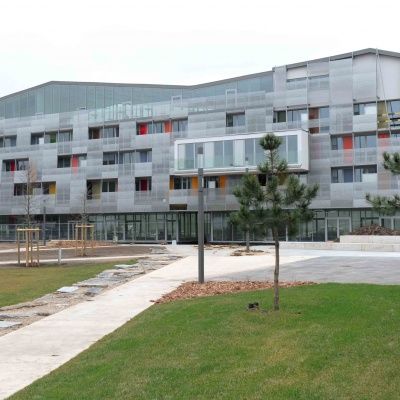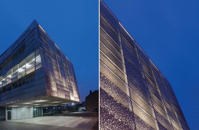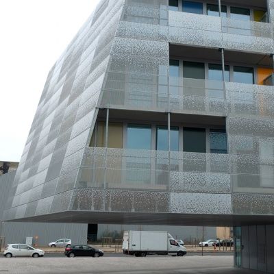 Véritable prouesse architecturale du bureau Jourdain Architectes Associés, le bâtiment a été conçu de manière à libérer le rez-de-chaussée pour offrir depuis la rue une vue sur le parc urbain situé à l’arrière du bâtiment. Celui-ci peut dès lors être perçu aisément depuis la voirie et le futur rond-point, créant ainsi une liaison verte dans la ville. La façade, habillée d’un revêtement métallique perforé de manière variable apporte confort lumineux et sécurité, renforce le caractère moderne de l’édifice et rappelle le passé sidérurgique de la ville. Ce revêtement permet à la fois de protéger les habitants du soleil, de libérer les vues et les balcons et d’intégrer la fonction de garde-corps. Le choix du métal et la complexité des percements d’apparence aléatoire constituent une recherche en rapport avec la tradition métallurgique de la région. Derrière la paroi métallique, en second plan, les menuiseries rythmées par un jeu de couleurs viennent affirmer le corps principal et la structure du bâtiment.