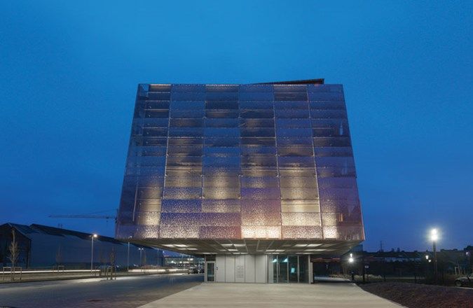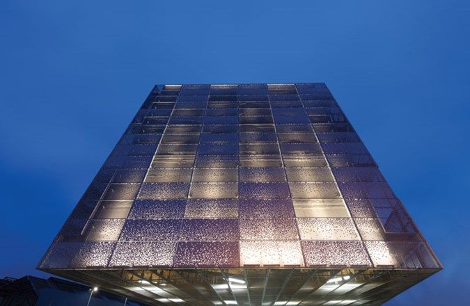 La société Schréder a installé son luminaire SCULPLine qui, avec son design épuré et compact, répond parfaitement à ce défi. Ce projecteur linéaire s’intègre discrètement à la structure pour révéler les matières et la beauté du bâtiment. Afin d’éclairer toute la hauteur de la façade, une photométrie en faisceau lumineux très concentrant a été choisie. Le choix de la couleur des LED blanc chaud offre un contraste avec l’éclairage blanc neutre de la voirie et met en valeur cette architecture remarquable, signe incontestable de la métamorphose de la ville.