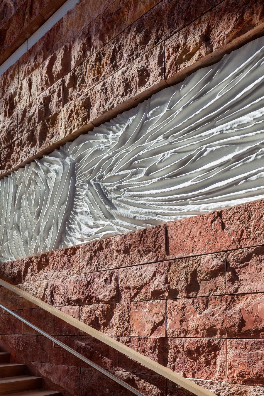 L'atrium consiste en une structure de béton tridimensionnelle sous la forme de molécules imbriquées formant une dentelle d'ovales, de triangles et d'hexagones. La lumière du jour entrant par les fenêtres circulaires forme comme une 'couronne de verre' sous laquelle scientifiques, membres du personnel, étudiants et familles se rencontrent, renforçant ainsi la monumentalité de l’espace.
