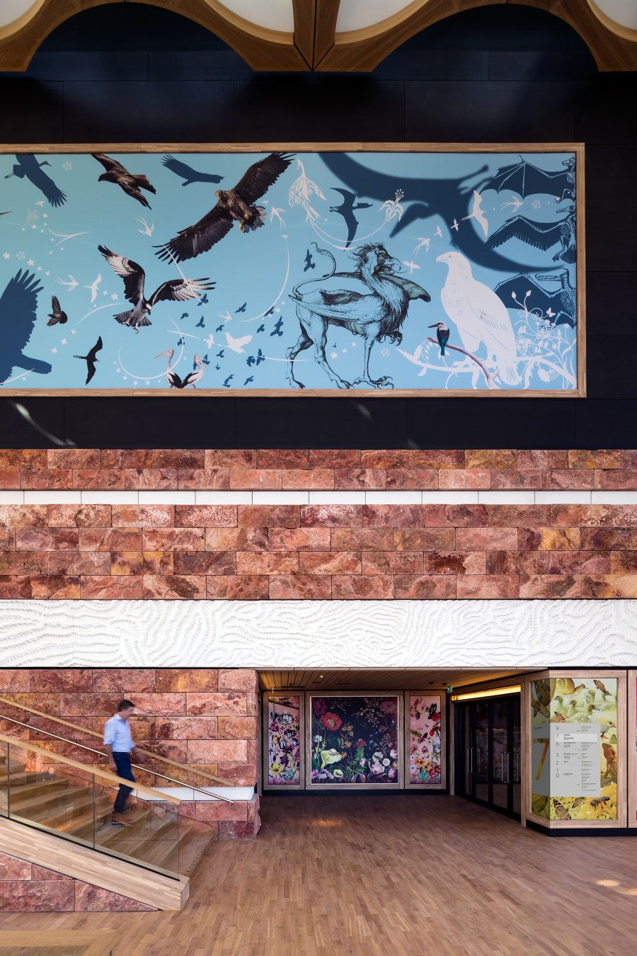 Des fonctions publiques telles qu'un restaurant, un magasin et le hall d’exposition se trouvent au rez-de-chaussée. L'escalier principal menant aux expositions ressemble à un sentier de montagne, il devient plus étroit au sommet et dispose de suffisamment d'espace pour accueillir Trix, un T-Rex âgé de 66 millions d'années mis à l'honneur dans la galerie Dino Era.