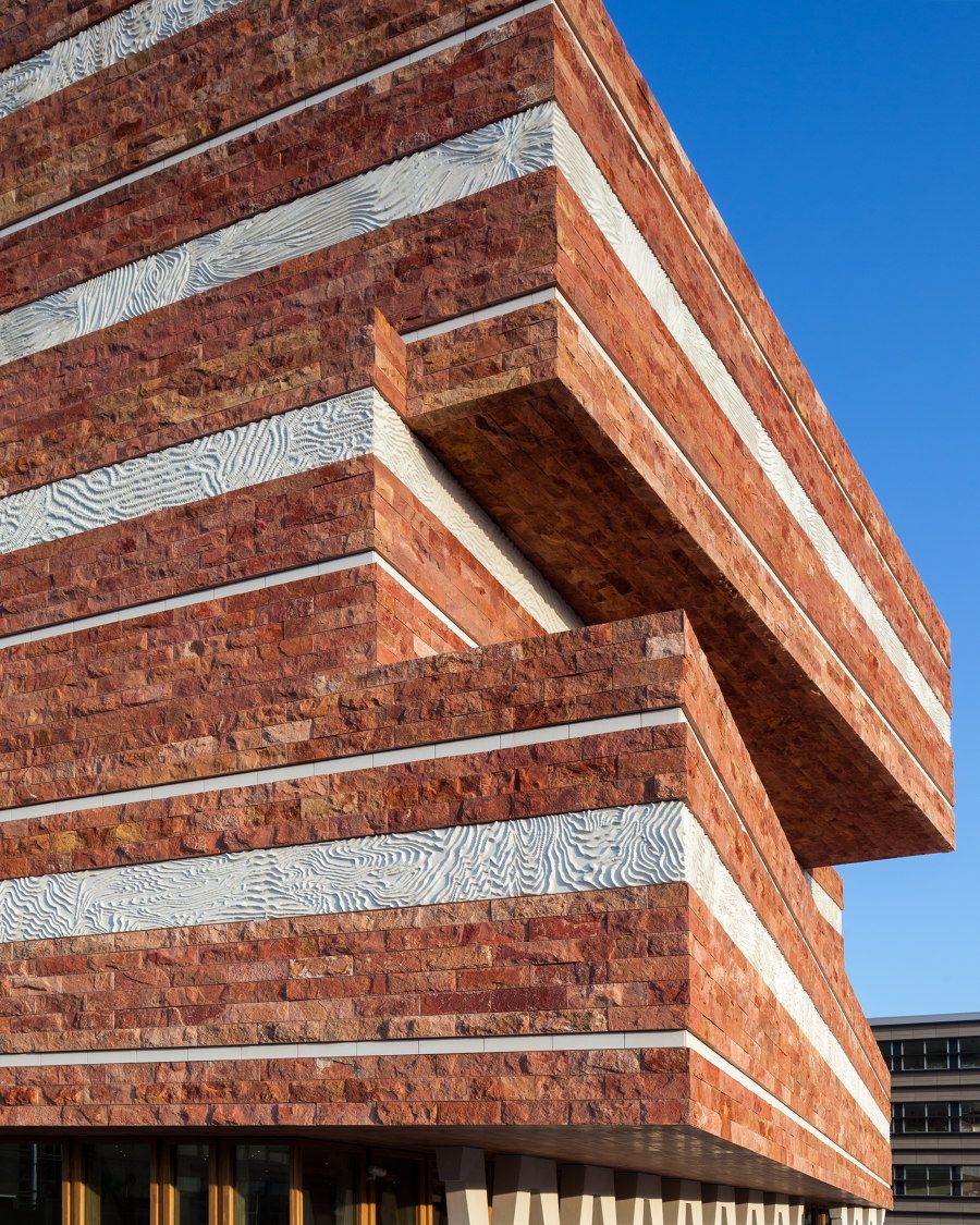 L'extérieur des salles d'exposition, formé de blocs de briques en couches horizontales, imite une structure géologique. La variété de pierre de travertin utilisée a été choisie parce qu'elle avait développé sur une période de plusieurs siècles, des cristaux naturels, créant un éclat inédit. Les couches de briques sont entrecoupées de frises de béton blanc, conçues par la célèbre designer néerlandaise Iris van Herpen. A la demande de Neutelings Riedijk Architecten, elle a conçu un total de 263 panneaux inspirés par les formes naturelles des collections du musée. Ces panneaux semblent, en apparence, lisses comme de la soie, grâce à une technique spéciale développée dans le cadre du projet Naturalis. Cette ressemblance avec le tissu évoque les robes innovantes conçues par Iris Van Herpen pour des célébrités telles que Cate Blanchett, Beyoncé et Lady Gaga.