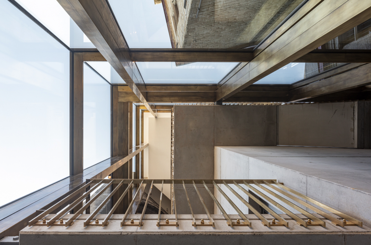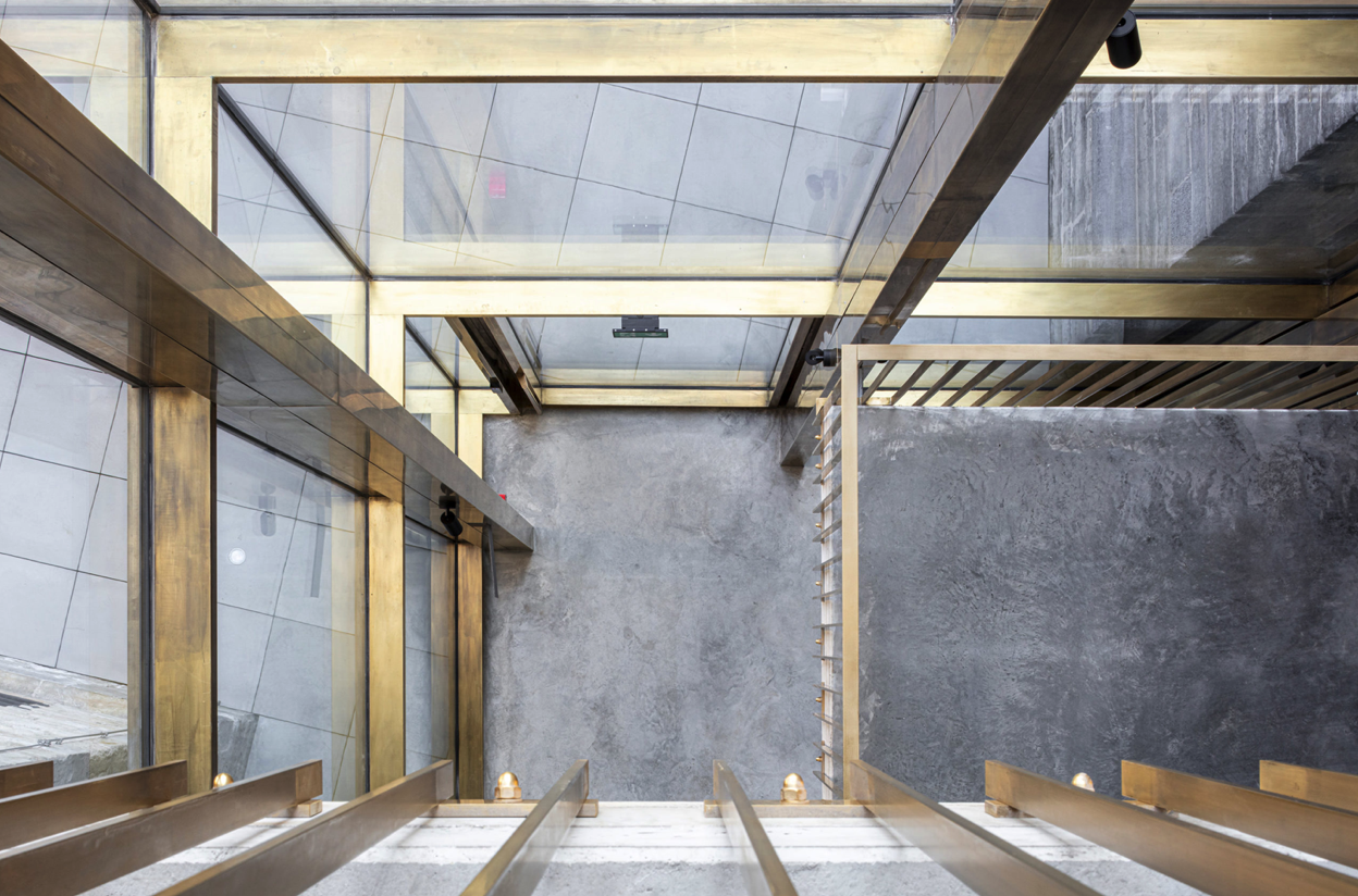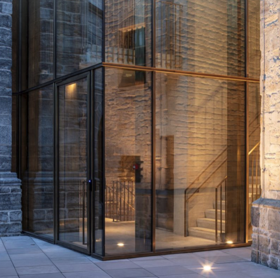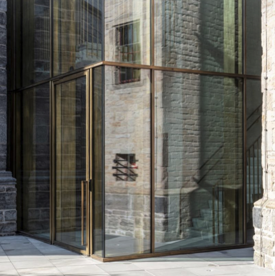 Le choix des matériaux a également joué un rôle important pour assurer la continuité. Les nouveaux éléments sont en grande partie en verre, de sorte que les visiteurs peuvent toujours voir le tissu de la cathédrale d’origine. Inévitablement, il y a une confrontation entre les éléments nouveaux et anciens. Pour mettre subtilement en scène les principales attractions du bâtiment, les zones transparentes ont été complétées par du bois, du béton et des carreaux de céramique simples. Le métal, ou plus précisément le laiton, constitue le lien avec les éléments existants puisqu’il est utilisé de manière proéminente partout. Les nouvelles portes et fenêtres métalliques incurvées du vestibule de la cathédrale en sont un exemple. Ils sont constitués de profilés en acier Jansen VISS à haute isolation thermique et d’un couvercle, normalement disponible en aluminium, mais dans ce cas, en laiton et en bronze.