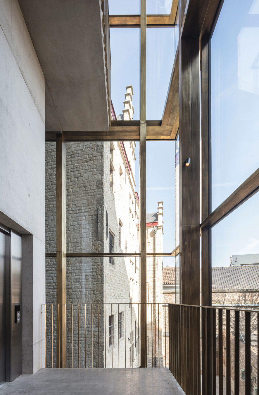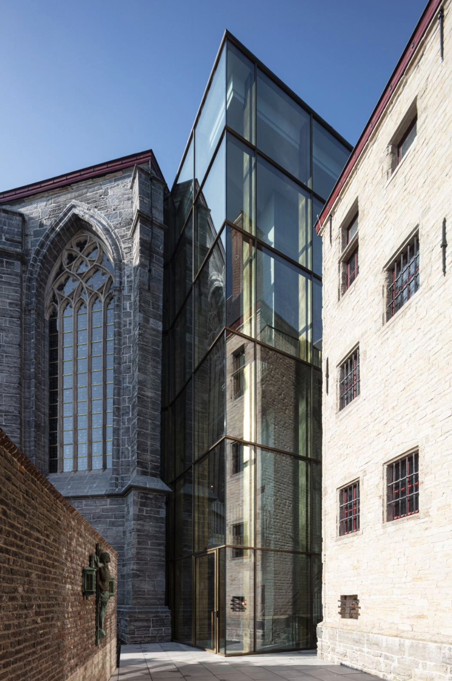 Depuis la crypte, l’itinéraire mène au point culminant de la visite : l'”Agneau de Dieu” des van Eyck dans la chapelle du Sacrement. Pour garantir un accès direct et sans obstacle à ces pièces et aux différents étages, le cabinet gantois Bressers Architects a conçu une tour d’escaliers en verre pour le mur extérieur. Leur intervention a suivi deux principes de conception importants : la continuité et la confrontation. Dans toutes les nouvelles interventions, l’objectif est de s’intégrer autant que possible dans l’architecture existante. Dans le cas de la cathédrale, cet objectif a été atteint en répétant constamment le langage architectural et en créant un “chemin clair” à travers la série de zones de circulation.