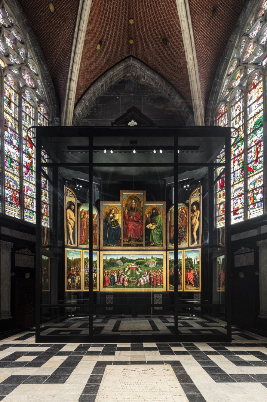 La restauration de cette importante œuvre d’art a été le moteur du projet de création d’un nouveau centre d’accueil ambitieux. C’était d’autant plus important que le projet touristique régional “Flemish Masters” a été lancé et qu’il est apparu clairement que les œuvres d’art devaient être mieux exposées et rendues plus accessibles. C’est pourquoi le célèbre retable a été remis en évidence dans son lieu de culte, à savoir la chapelle sacramentelle de la cathédrale. Intégrer l’œuvre d’art dans son cadre liturgique d’origine implique de l’exposer dans un endroit optimal, mais cela pose également des défis considérables. Aujourd’hui, l’œuvre précieuse est protégée par une vitrine climatisée. Un autre problème est né du fait qu’il s’agit d’un lieu de culte activement utilisé qui est principalement destiné à des fins liturgiques et qui doit rester ouvert aux croyants. En outre, il a fallu créer des itinéraires pour les visiteurs principalement intéressés par les objets culturels, afin que les différents flux de visiteurs soient organisés et répartis de la manière la plus harmonieuse possible. Et tout cela sans porter atteinte au bâtiment historique.