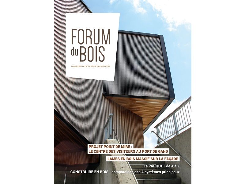 Pour mettre l'universalité du bois en exergue, pour informer et surtout pour inspirer les architectes, le nouveau magazine 'forum du bois' a été créé en collaboration avec l'UNEBO, l'union nationale des entreprises du bois. Le premier numéro de 'Forum du Bois' sera distribué fin novembre par la poste à tous les architectes de Belgique (10.000 ex.) et pourra également se feuilleter en ligne sur www.forumdubois.be.