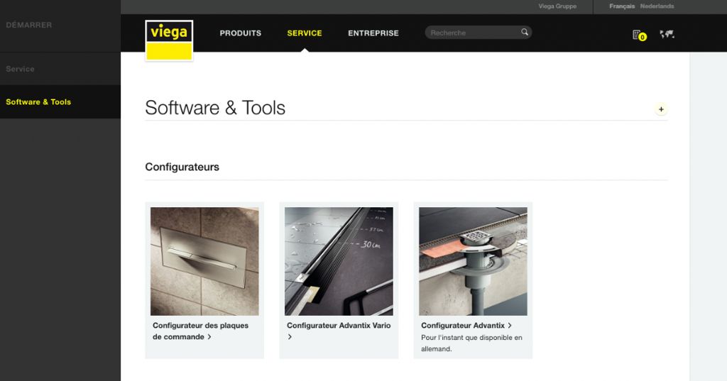 L’onglet ‘service’ affiche quelques pratiques configurateurs : plaques de commande, Advantix Vario et Advantix. De plus, grâce à l’appli Catalogue, l’assortiment des produits commercialisés en Belgique est consultable ‘offline’ sur tablette et smartphone – c’est-à-dire partout et à tout moment : sur le chantier, chez le client, ou pendant les trajets en voiture.