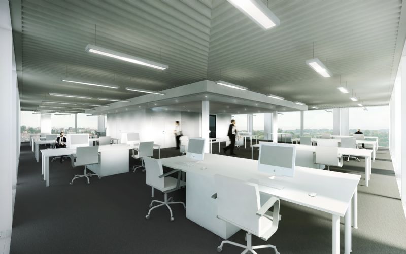 Le bureau Neo&Ides a insufflé toutes les mesures d’économies d’énergie dès la conception, conformément aux exigences en vigueur. L’installation emploie notamment un système de free-chilling et est pilotée par un système de gestion technique centralisée. Au point de vue énergétique, la particularité du bâtiment est la réalisation de dalles activées préfabriquées en béton. Celles-ci forment un plafond froid qui régule la température du bâtiment en période estivale (night cooling). Leur face inférieure est ondulée ce qui augmente le développement de la surface de rayonnement et donc l’efficacité du système. Les dalles ont été conçues pour apporter le confort thermique attendu mais aussi pour créer une surface agréable visuellement, permettant de se passer de faux-plafonds. L’absence de finition a ici une double fonction : celle que ne pas entraver le rayonnement thermique et celle de limiter les hauteurs d’étage. Un niveau supplémentaire a ainsi pu être créé dans un gabarit limité. Le reste des techniques est intégré dans des planchers techniques ou des faux-plafonds ponctuels, limités aux espaces de circulation. Enfin, un autre défi du projet concerne l’intégration des installations techniques. En effet, situé en zone résidentielle, il était primordial d’éviter toutes nuisances pour le voisinage. L’ensemble des appareils a donc été regroupé à l’arrière de la parcelle, à l’abri des regards, derrière des murs mitoyens. Au niveau acoustique, l’installation a été surdimensionnée. Elle fonctionne ainsi à bas régime ce qui limite le bruit. Des caissettes perforées ont également été prévues pour absorber les nuisances sonores résiduelles.
