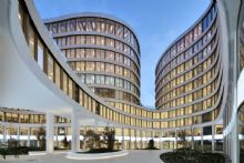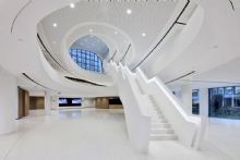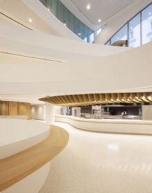 D’un point de vue architectural, le bâtiment tout en courbes rend le processus nettement plus complexe, depuis les premières phases du projet jusqu’aux parachèvements. Selon Jenny Scherrer, une des difficultés réside dans « la standardisation de certains éléments dans un univers composé de lignes organiques. Nous avons donc dû développer des solutions de fabrication à la fois esthétiques et optimales, notamment pour les faux-plafonds. L’atrium, qui se déploie sur quatre niveaux avec des volumétries courbes, a été lui aussi très complexe. Nous avons également dû travailler pour toute la structure du bâtiment avec des dalles post-contraintes à l’épaisseur minimale et nous avons dû composer avec une pente impressionnante au niveau de la toiture (R+9 d’un côté, 6 niveaux de l’autre), qui a réclamé une étude très poussée de la stabilité. »