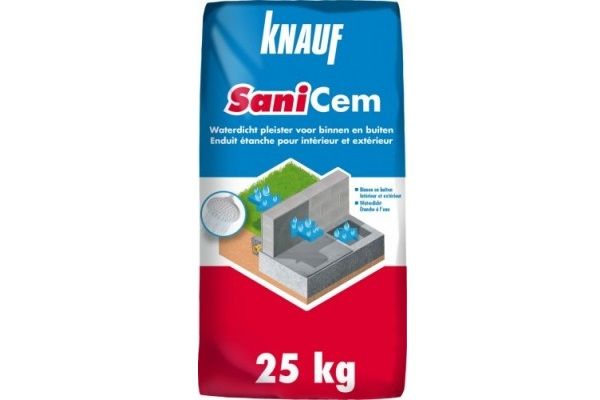 Knauf SaniCem est un nouveau mortier sec minéral, mélangé en usine et prêt à l’emploi, doté d’une très grande étanchéité. Il s’utilise aussi sur les maçonneries de caves à l’intérieur et à l’extérieur, pour des soubassements extérieurs ou comme enduit mural dans des locaux humides, dans des halls de lavage, etc. Cet enduit à prise hydraulique convient tant pour l’intérieur que pour l’extérieur.