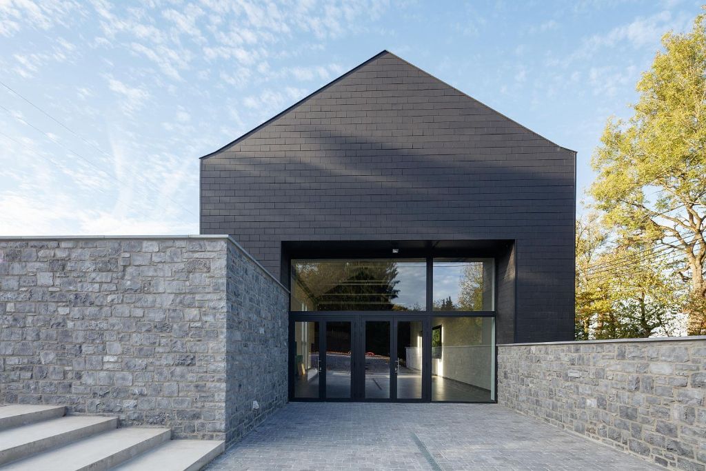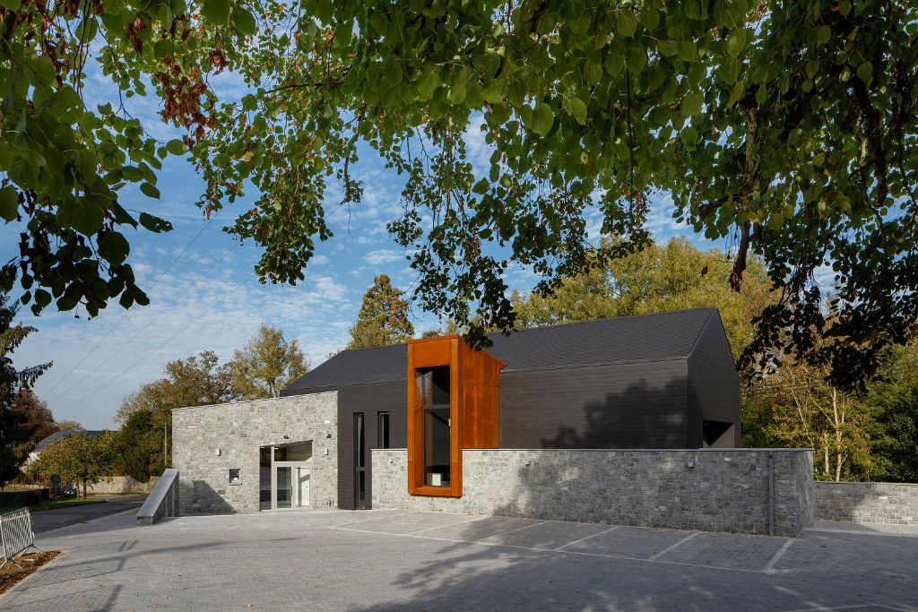 Alors que l’ancienne salle était implantée en recul de la parcelle, la nouvelle salle a été implantée au carrefour des rue d’Aye et de Borzillieux. Cette implantation permet de structurer le village en créant un effet de porte. Cela permet également de sécuriser le carrefour en le réduisant et en le redéfinissant clairement, tout en intégrant la différence de niveau. Enfin, cette implantation rationalise l’espace en dégageant un espace libre permettant l’aménagement d’abords plus intéressants : terrasse dans le prolongement de la salle, zone de jeux, zone de parkings, … A l’intérieur, la nouvelle salle offre une capacité d’accueil importante et propose un beau grand volume, mis en évidence par l’apport de lumière naturelle.