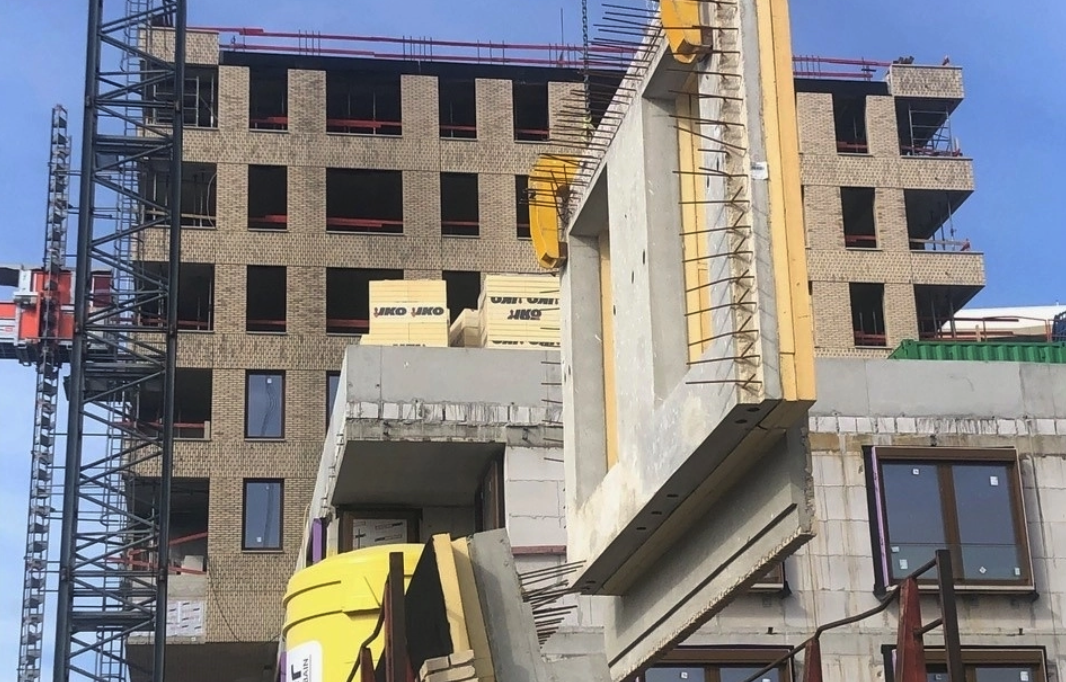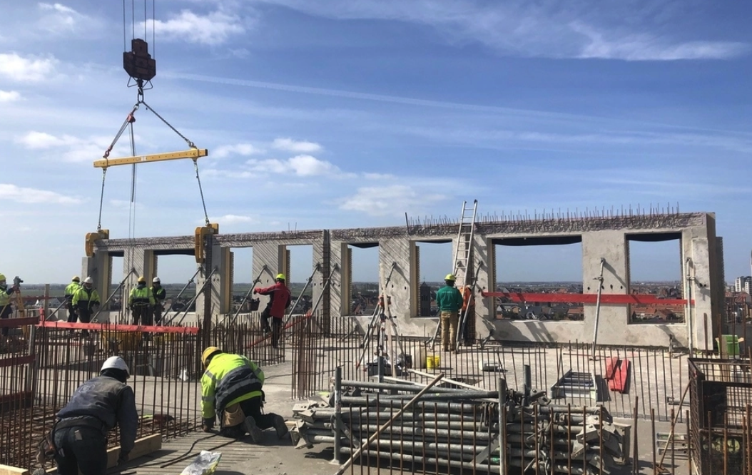 Nous avons trouvé en Loveld (Aalter) un partenaire doté d’une riche expérience à l’étranger dans ce domaine. Cette collaboration a évité à l’entrepreneur de nombreux soucis financiers, logistiques, techniques et organisationnels liés aux travaux de maçonnerie traditionnels à de telles hauteurs. Pensez par exemple aux assemblages à grande hauteur ou au montage d’échafaudages. La taille de ces murs en béton fabriqués hors site et habillés de mulots encastrés est sans précédent en Belgique. Par ailleurs, dans l’une des tours, nous avons utilisé des éléments sandwichs portants comme appuis de plancher, une technique rarement mise en œuvre jusqu’à présent dans notre pays. Ces éléments se composent d’une coque extérieure décorative, d’un panneau isolant et d’une coque intérieure structurelle en béton qui supporte le plancher.