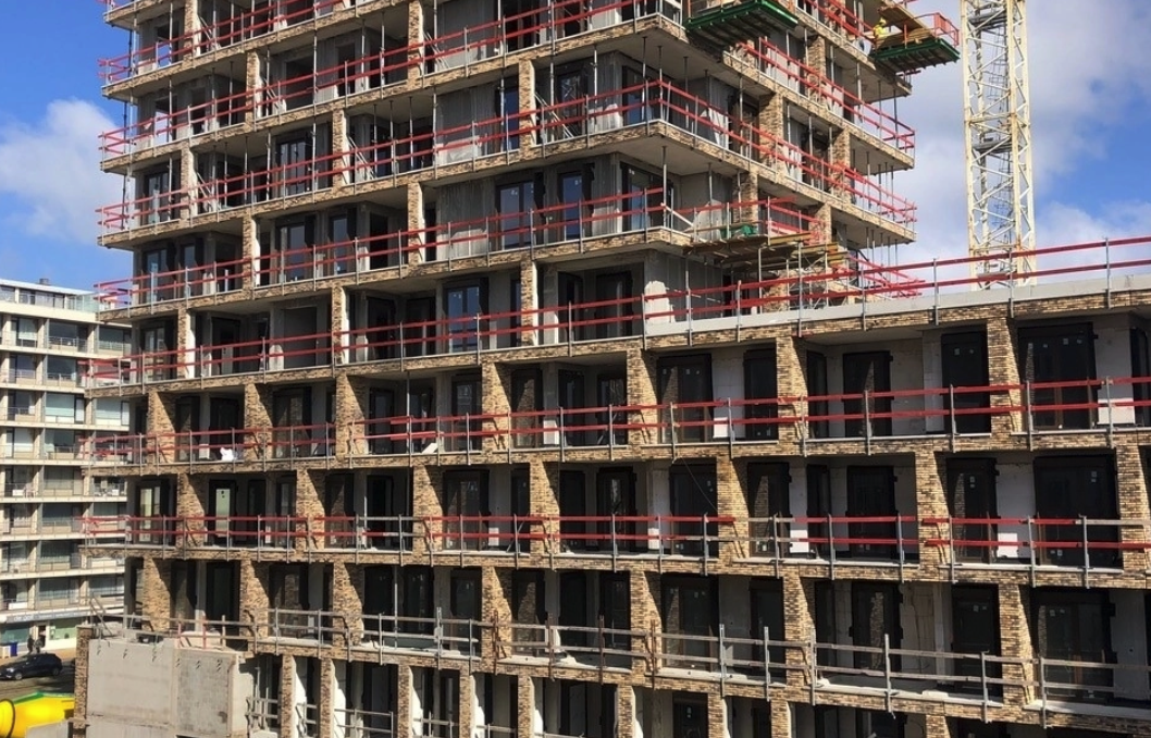 Les conditions de travail au littoral ne sont pourtant pas idéales pour utiliser des plaquettes de brique sur de grandes hauteurs. Dans sa recherche de solution, le promoteur du projet, BAM-Interbuild, s’est adressé au fabricant de briques Vandersanden. Cette rencontre a débouché sur la méthode de construction innovante mise en œuvre sur ce chantier : une structure composée d’éléments sandwichs finis, soit un système préfabriqué dans lequel les briques sont incorporées au préalable.