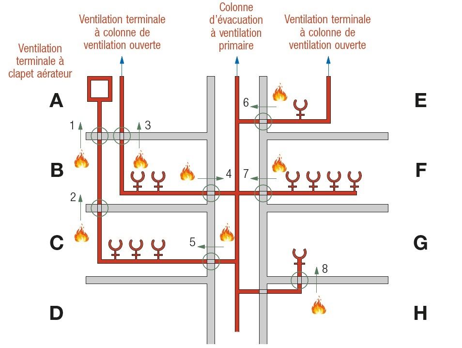 Dans le cas de conduites d’évacuation d’eau, différentes situations peuvent se rencontrer, comme en témoigne la figure ci-dessous. Prenons le cas d’un incendie dans le compartiment F et évaluons le risque de propagation depuis ce compartiment vers la trémie verticale par le biais d’une conduite sanitaire traversant la paroi résistant au feu (n° 7).
