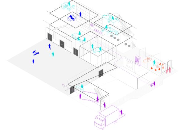 « Le complexe de bâtiments était autrefois un dépôt de charbon organisé autour d’une cour intérieure, derrière une série de maisons et d’appartements, dans une rue somme toute assez banale de ce quartier animé de Bruxelles », expliquent les architectes, Stephane Damsin et Jan Haerens. « Le théâtre du Rideau de Bruxelles a lancé un concours afin de transformer et de réorganiser l'ensemble du site pour y installer ses activités, tout en restant en harmonie avec le quartier. Nous nous trouvions face à cinq bâtiments différents - le plus grand étant l'ancien dépôt de charbon - tous organisés autour d'une cour. Chaque bâtiment fonctionnait indépendamment des autres et il fallait traverser la cour pour atteindre un autre bâtiment, ce qui n'était bien sûr pas confortable pour le public, les artistes, le personnel ou les voisins. Notre proposition a consisté à organiser des fonctions et des circulations dans et entre les cinq bâtiments. »