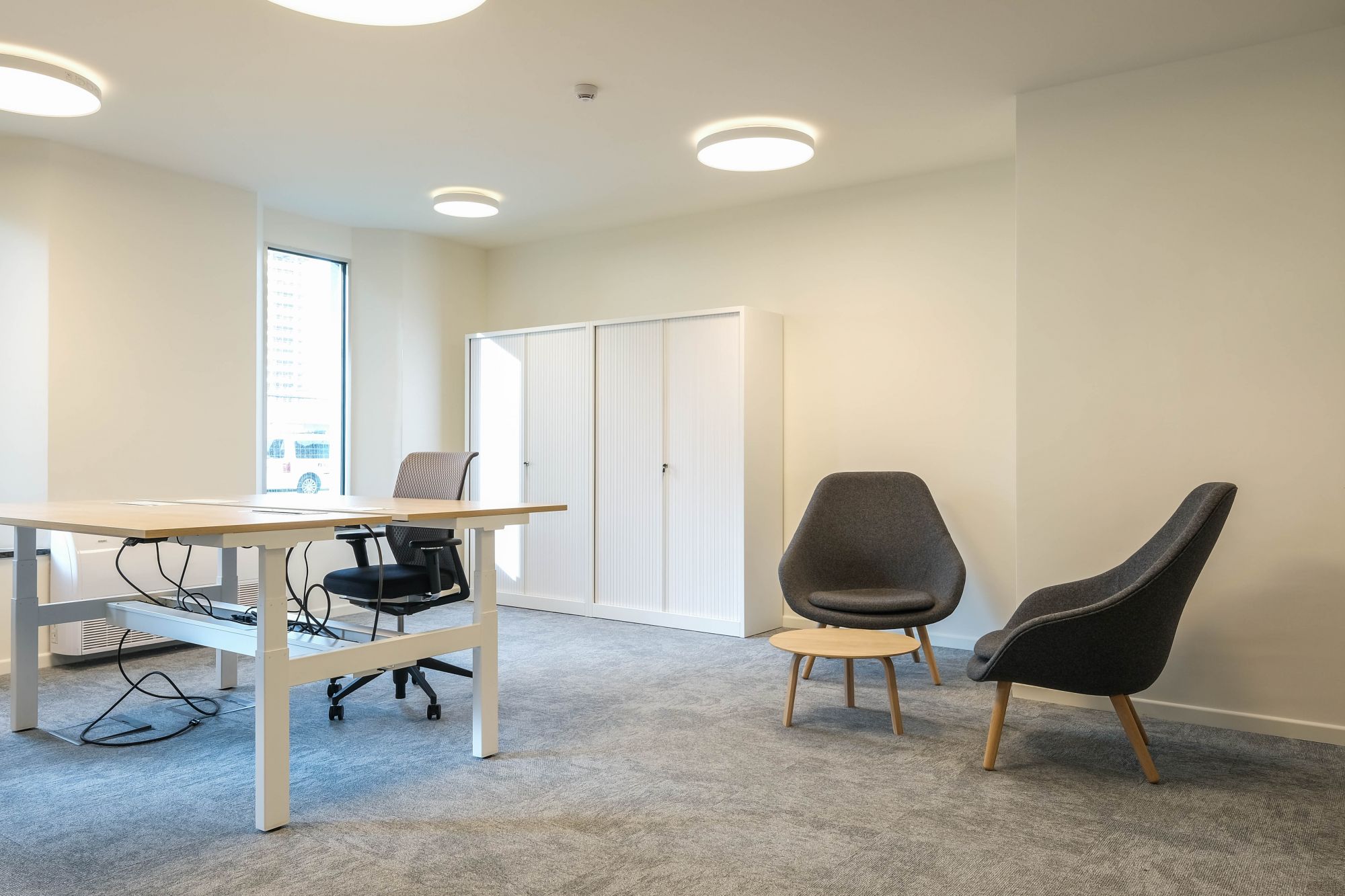 Le mobilier de la kitchenette et des alcôves, entre autres, a été fabriqué sur mesure. Une partie du mobilier sur mesure a été réalisée en corian. Enfin, Beddeleem a installé un éclairage de haute qualité, le câblage de données, l'électricité, la climatisation, la plomberie,...