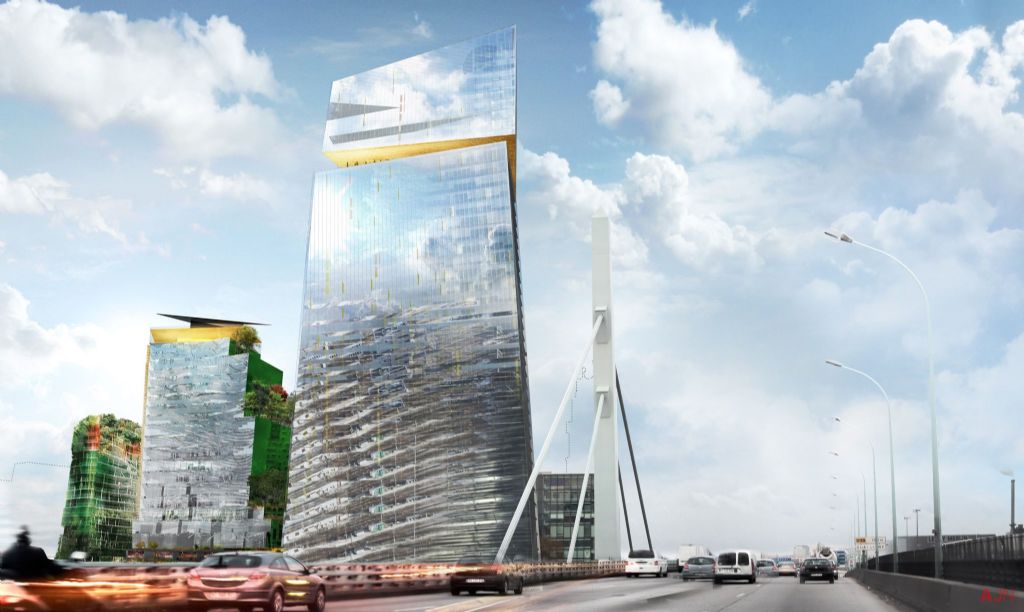 Surplombant boulevard périphérique et voies ferrés, ces tours asymétriques, en partie penchées « pour capter les reflets des voitures et des trains, de jour comme de nuit », accueilleront l'une 85.000 m2 de bureaux et l'autre, 30.000 m2 de commerces et un hôtel-restaurant.