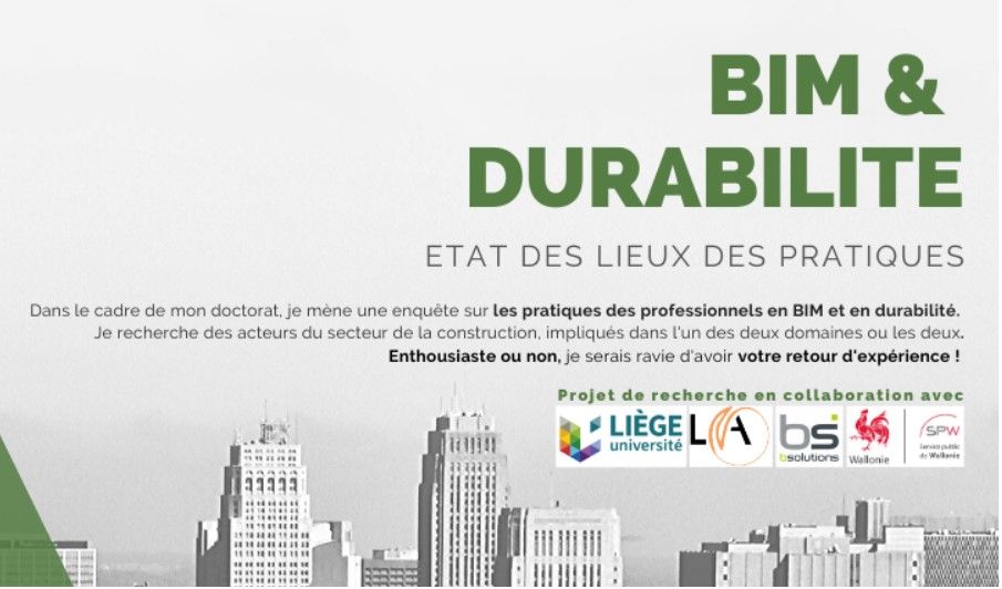 « Dans le cadre de mon doctorat, soutenu par le SPW et en collaboration avec la Faculté d’Architecture de l’Université de Liège et BSolutions, je mène une recherche sur les pratiques des professionnels en BIM et en durabilité », explique Charlotte Dautremont. « Je recherche en Europe - et en Belgique en particulier - des acteurs du secteur de la construction impliqués dans l’un des deux domaines ou dans les deux, qu’ils soient enthousiastes ou non à ces deux évolutions du secteur. »