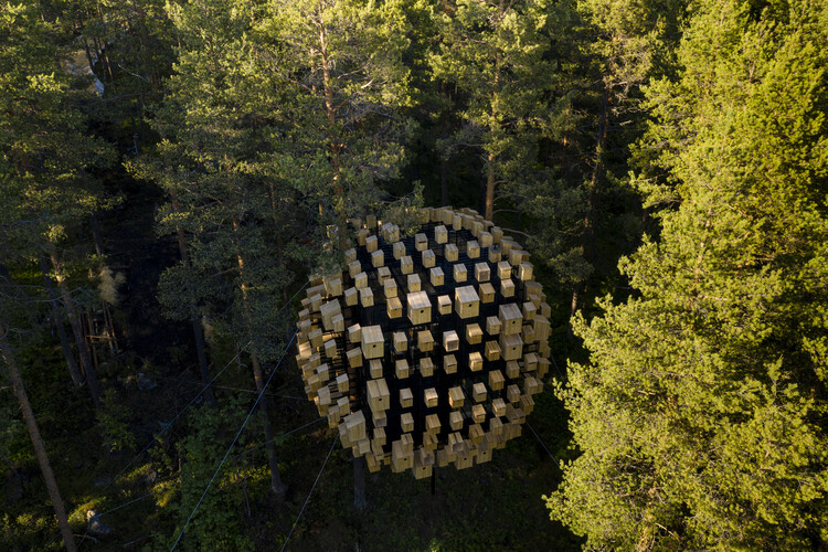 En étroite collaboration avec Treehotel et l’ornithologue suédois Ulf Öhman, la nouvelle chambre d’hôtel Biosphere conçue par BIG apportera 350 nichoirs à l’hôtel renommé. Suspendu dans les pins Harads, le design expérientiel de BIG est la huitième chambre d’hôtel de la propriété et cherche à améliorer la biosphère environnante.