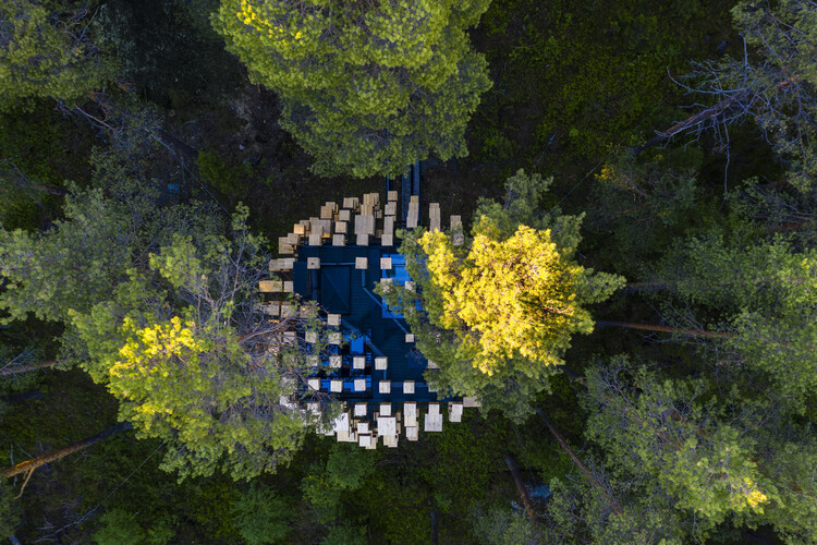 L’intérieur est simple et pragmatique, mais en raison de sa composition conceptuelle solide et ouverte en damier, il permet une gamme d’expériences dans un espace relativement petit. Les visiteurs ont accès à une terrasse sur le toit – à proximité des cimes des arbres – qui offre une vue à 360 degrés sur la forêt. En faisant varier les tailles individuelles des nids d’oiseaux et en les élargissant vers l’extérieur, et en fonction du type d’oiseau et de la fréquence dans la zone, la lumière peut pénétrer dans l’espace intérieur tout en maintenant les vues vers l’extérieur.