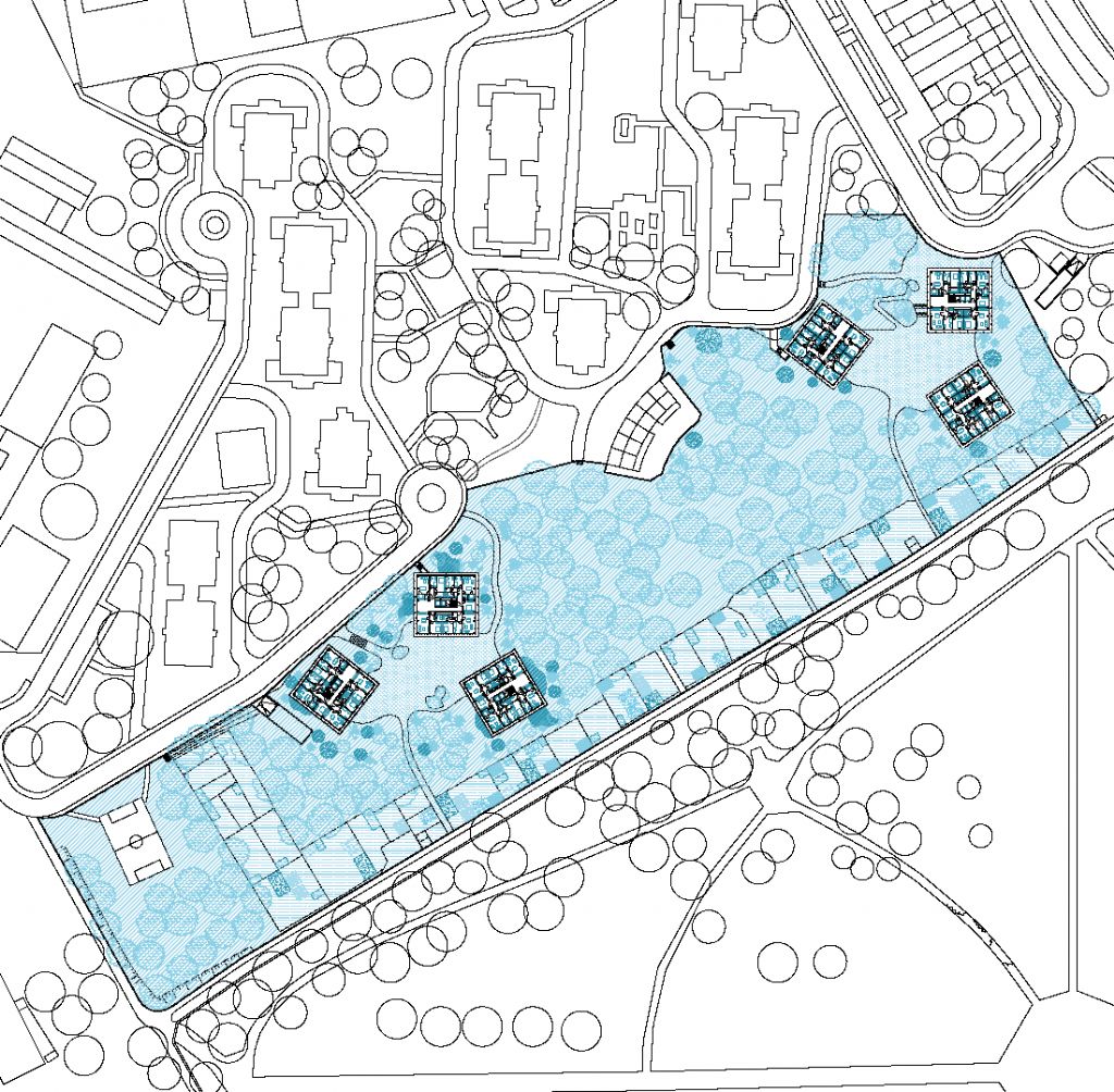 « Les gabarits choisis installent une dialectique qui prolonge et reformule ceux du quartier de logements voisin. Chaque trio de tours définit une placette minérale qui s’adresse à la collectivité élargie. Ce 'salon extérieur' est activé par une plinthe urbaine d’espaces communautaires variés (serres, atelier de bricolage, laverie, etc…). D’autres espaces partagés animent les étages, à un niveau de collectivité plus restreint. Autour de ces deux clairières habitées, la bande boisée est enrichie de potagers supplémentaires et confortée dans son rôle de forêt productive et d’incubateur de lien social pour l’ensemble du projet et du quartier. »