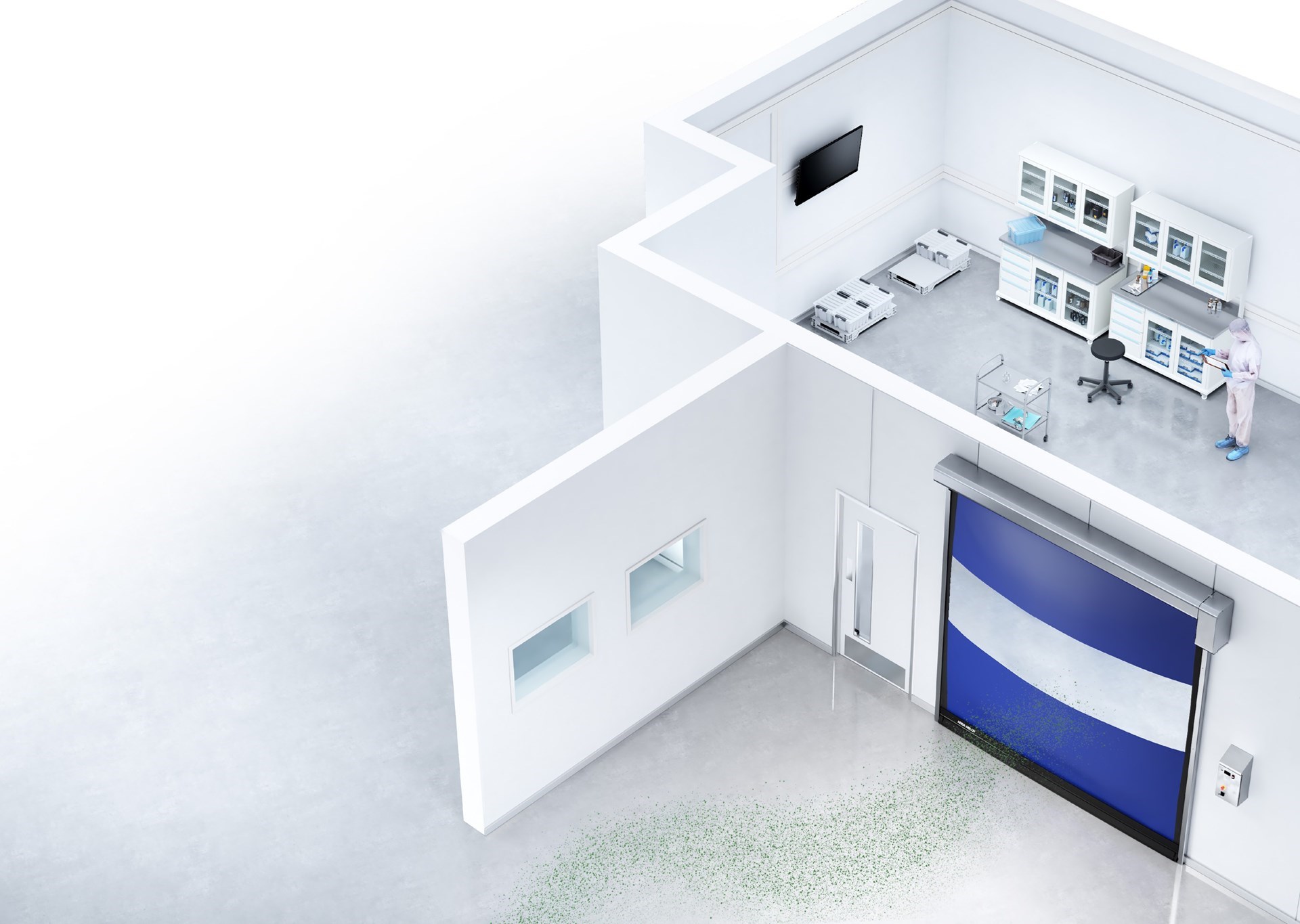 Les portes rapides hermétiques à l'air sont cruciales pour le bon fonctionnement des salles blanches bien régulées. Dans ces environnements, la contamination de l'air doit être réduite au minimum et des facteurs tels que la température et l'humidité doivent être surveillés de près. L'ASSA ABLOY HS9120GAT garantit une étanchéité parfaite et est spécialement conçu pour les environnements de salle blanche certifiés GMP classe D et ISO 8. Ce nouveau venu répond parfaitement aux exigences de l'industrie, sans compromis en termes de sécurité, de coûts et d'efficacité.