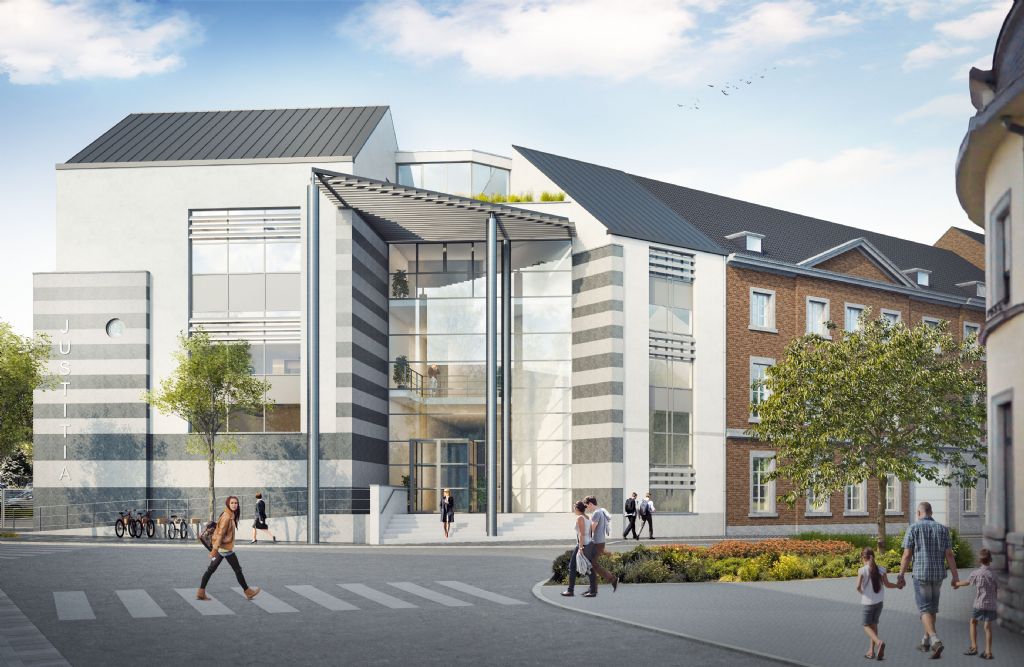 Le futur complexe se présente comme une continuité du tissu urbain existant. La volumétrie se raccorde parfaitement aux bâtiments voués à être conservés et rénovés. Les matériaux choisis, à savoir le crépi clair, les grands pans vitrés, la pierre bleue et l’acier, apporteront un véritable aspect contemporain. L’entrée, marquée par une grande entaille vitrée, sera clairement identifiable et hautement symbolique : la justice transparente et ouverte à tous.