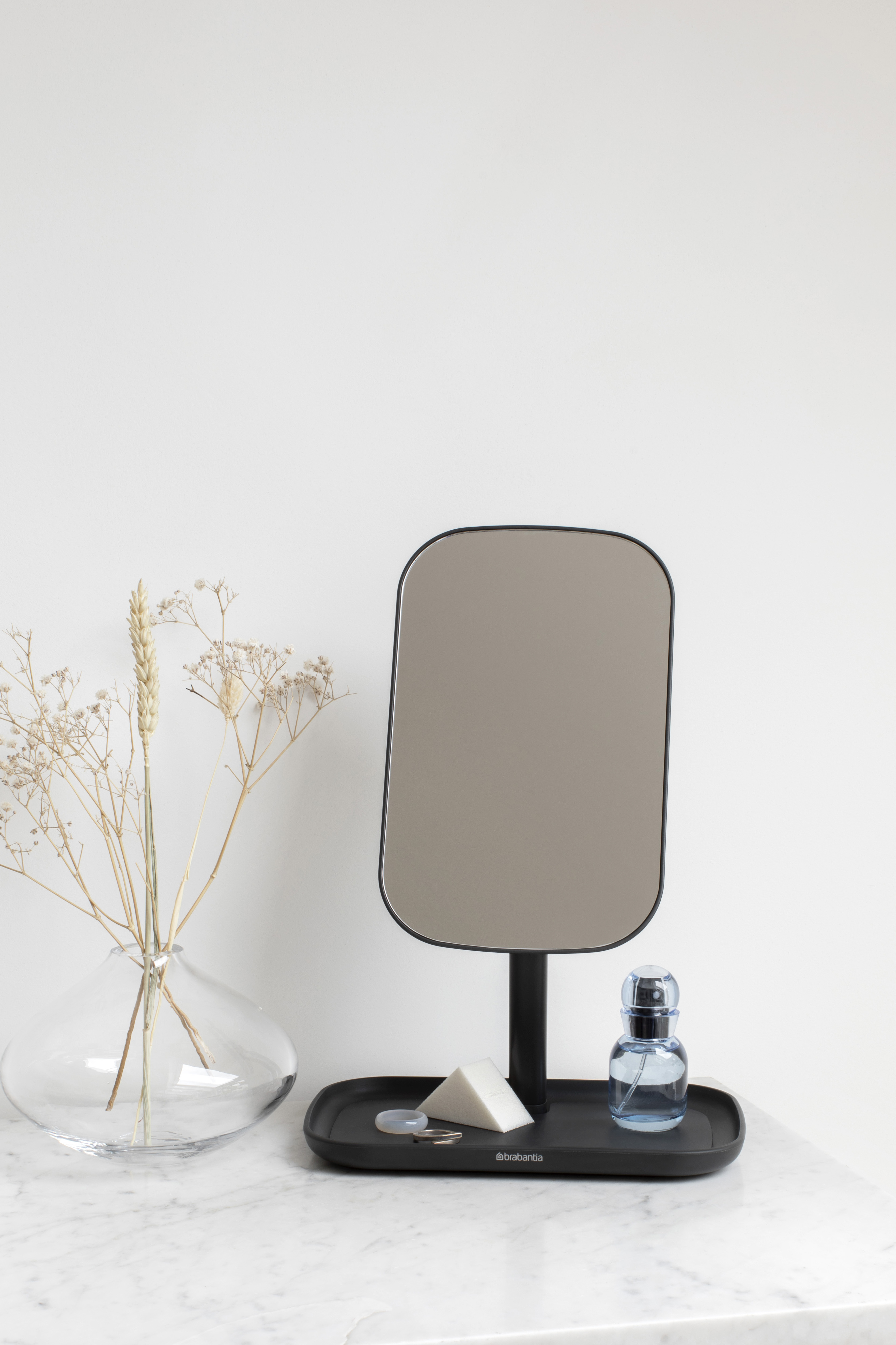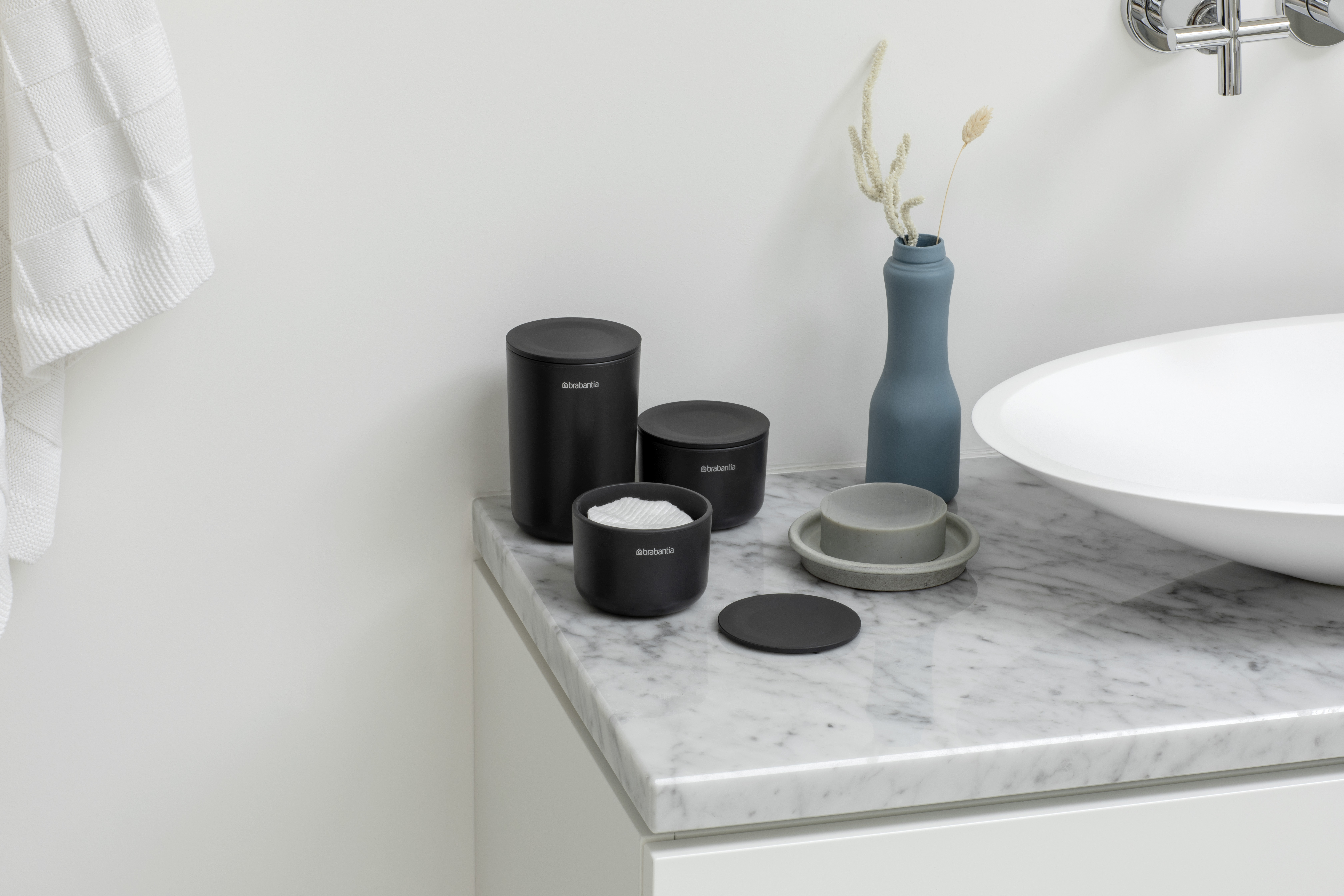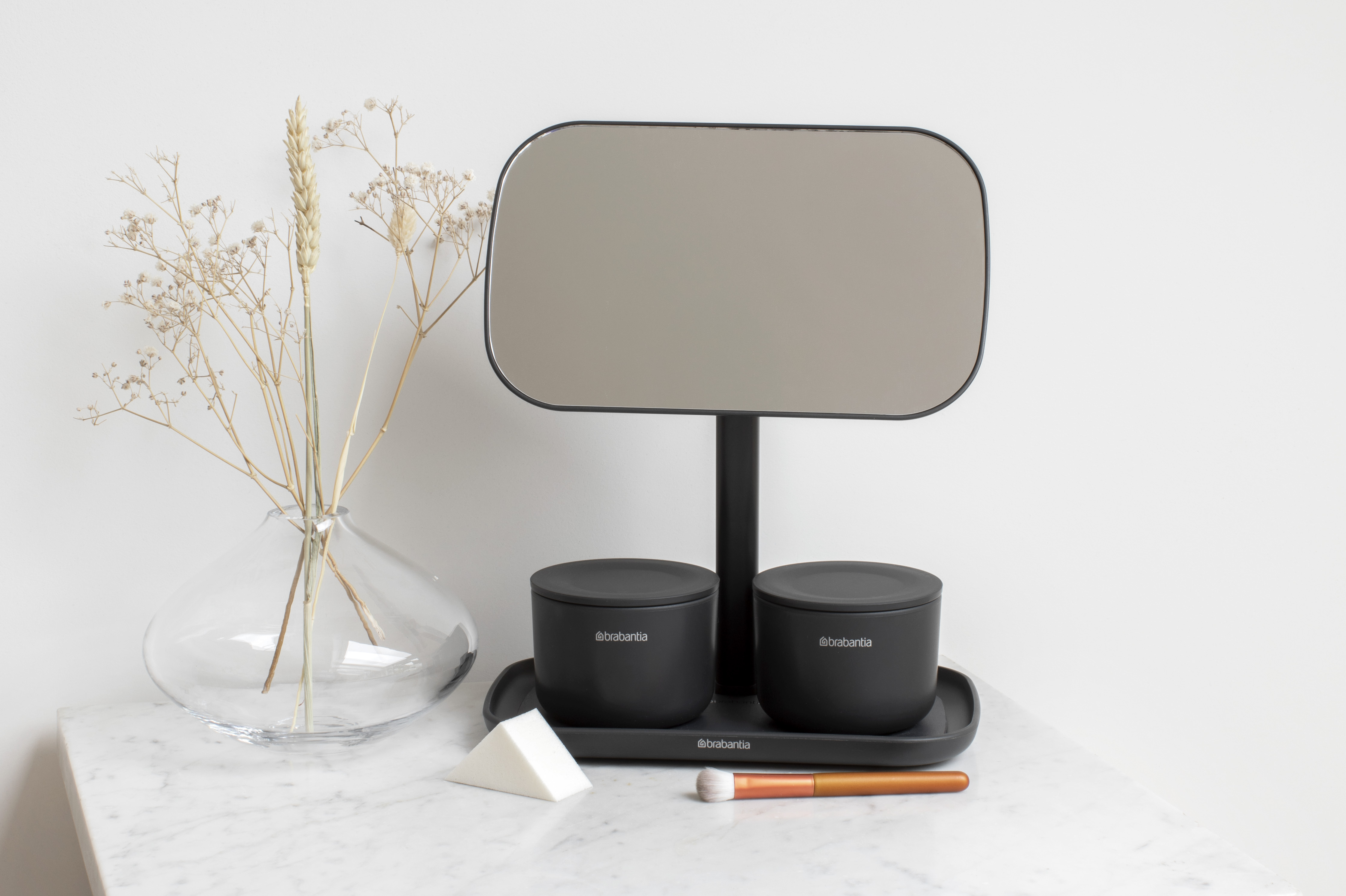 Brabantia lance donc 4 nouveaux accessoires dans la collection ReNew : un miroir, un pèse-personne, un serviteur de douche et un ensemble de pots de rangement empilables - en blanc et gris foncé. Twan Verdonck : « Ils s'intègrent ainsi parfaitement aux deux types de salle de bain. Certaines personnes choisissent le blanc. Elles veulent de la fraîcheur et de la clarté, veulent profiter de leur salle de bain le matin. Mais d'autres préfèrent le platine gris foncé et le noir, pour une ambiance plus chaleureuse. Elles apprécient particulièrement leur salle de bain le soir, ce qui leur permet de prendre du temps pour soi. »