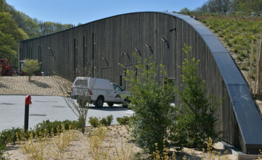 Pour l’intégrer au mieux dans l’environnement, le chai a été doté d’une toiture verte tandis que la partie visible de la construction est recouverte d’un bardage en douglas noir. « Nous avons trouvé un fournisseur qui a accepté d’autoclaver le bois avec un pigment noir plutôt que vert. Visuellement, la construction se fond idéalement avec le sous-bois du décor », ajoute l’architecte.