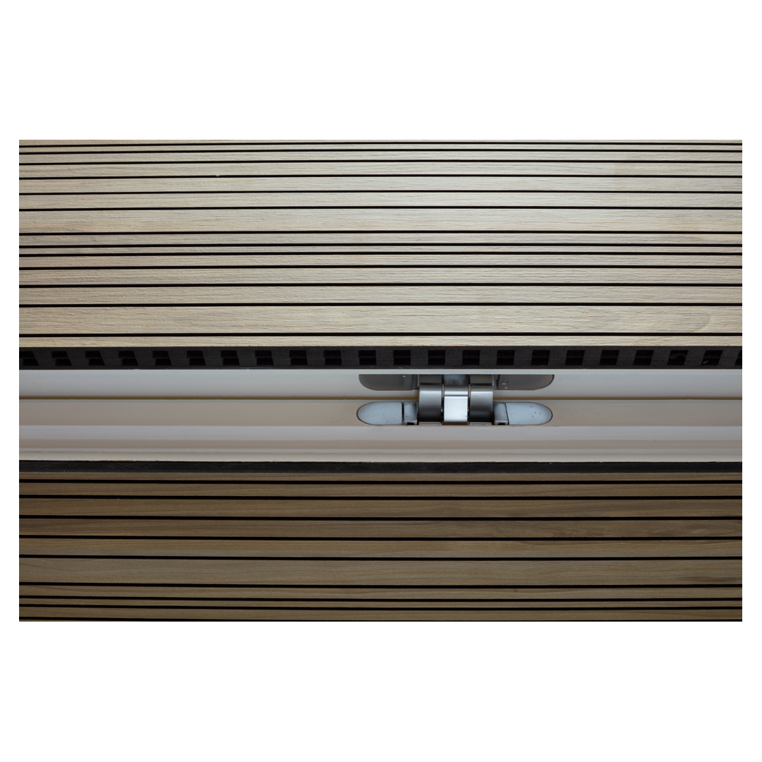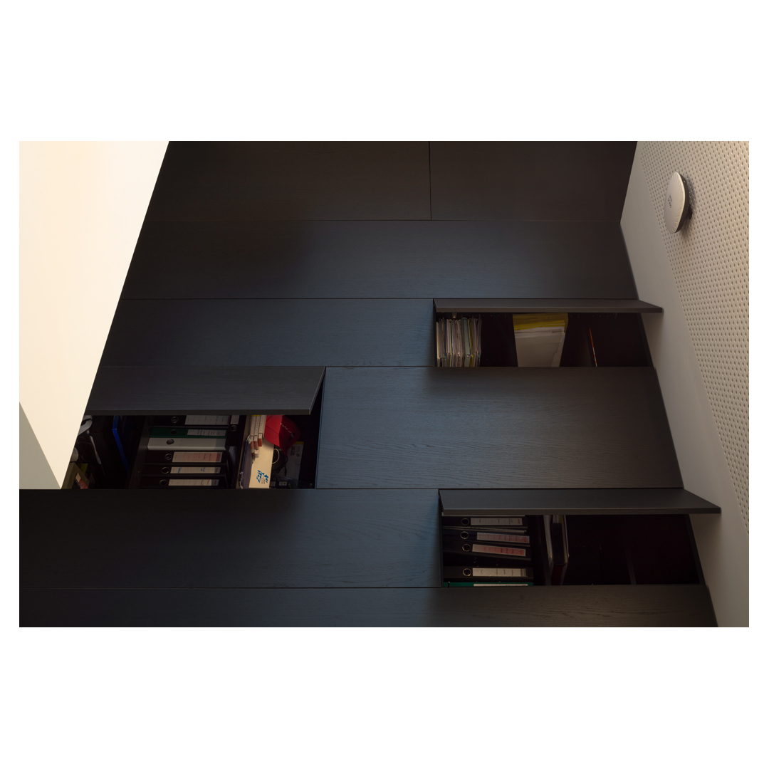 Le client a opté, au rez-de-chaussée et au premier étage, pour une finition Woodcoustics Placage Decospan de la gamme Shinnoki en couleur chêne, teinte Chocolate oak, sur âme MDF noire acoustique. Le chêne chocolat foncé, avec les nano perforations presqu’invisibles (diamètre 0,5 mm) apparaît sur les cloisons fixes et les portes d’armoires sur mesure. Il se combine parfaitement avec les plafonds en béton et les baies vitrées.