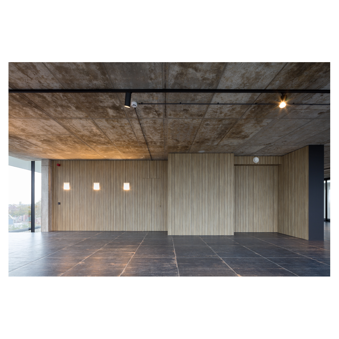 Dans la salle d'expo, fortement vitrée et aux dalles de plafond en béton, l’architecte a proposé pour les murs le Print acoustics Type Dr avec une surface stratifiée, imitation bois 0668ROT d’Abet Laminati, sur âme MDF noire acoustique, facile d'entretien et résistant à l’abrasion. Ce produit présente des rainures aléatoires. Pour d'autres murs et portes d'armoire, on a utilisé des produits Woodcoustics Type N à nano perforation.