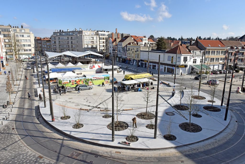 La place Dumon est un important noyau commercial, résidentiel et de services. Par la présence du tram, du metro et du bus l’ensemble constitue un lieu intermodal important. Le réaménagement de la place s’appuie sur sa forme ovale, caractéristique, pour transformer le parking en plein air en un véritable espace public. La forme de la place est soulignée par un muret en béton qui définit un intérieur dédié aux fonctions de séjours et un extérieur qui soutient et organise les dynamiques de la ville. L’espace dédié aux voitures et aux transports en commun est réduit à une bande afin d’offrir plus d’espace pour la circulation piétonne et cycliste. Sur la place un large auvent abrite ,entre autres, un petit pavillon dédié à l’horeca. De l’autre côté est installé un espace convivial avec des arbres, des bancs et une fontaine.