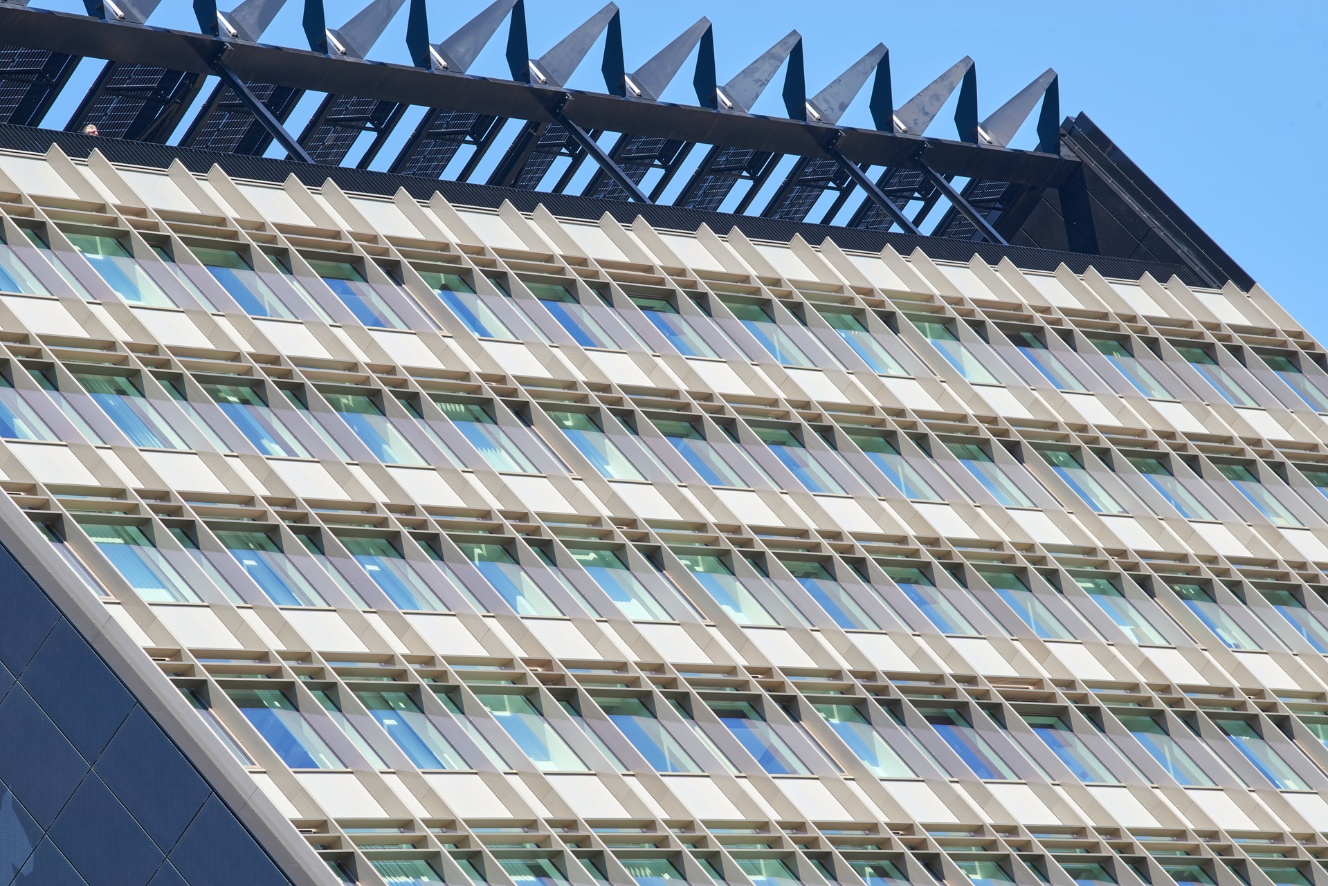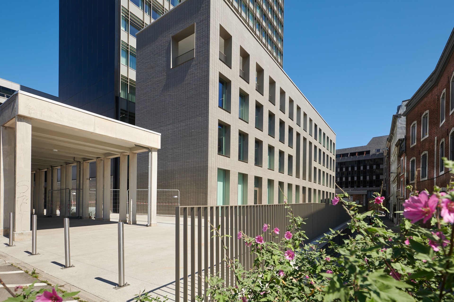Stéphane Marville : « Pour tous les étages de la tour dédiés à l'accueil du public et aux programmes collectifs (salles de réunion, cafétéria, …), nous avons proposé d’étendre le bâtiment côté Meuse. » Si l’enveloppe de la tour a été traitée en mur-rideau – à l’exception des façades latérales entièrement recouvertes sur 1600 m2 de panneaux photovoltaïques architecturaux collés – le nouveau volume a été quant à lui été réalisé comme une structure en éléments préfabriqués en béton avec des percements pour accueillir de grandes baies vitrées. Groven+ Portal a prévu des châssis traditionnels avec de grands ébrasements en aluminium anodisé.