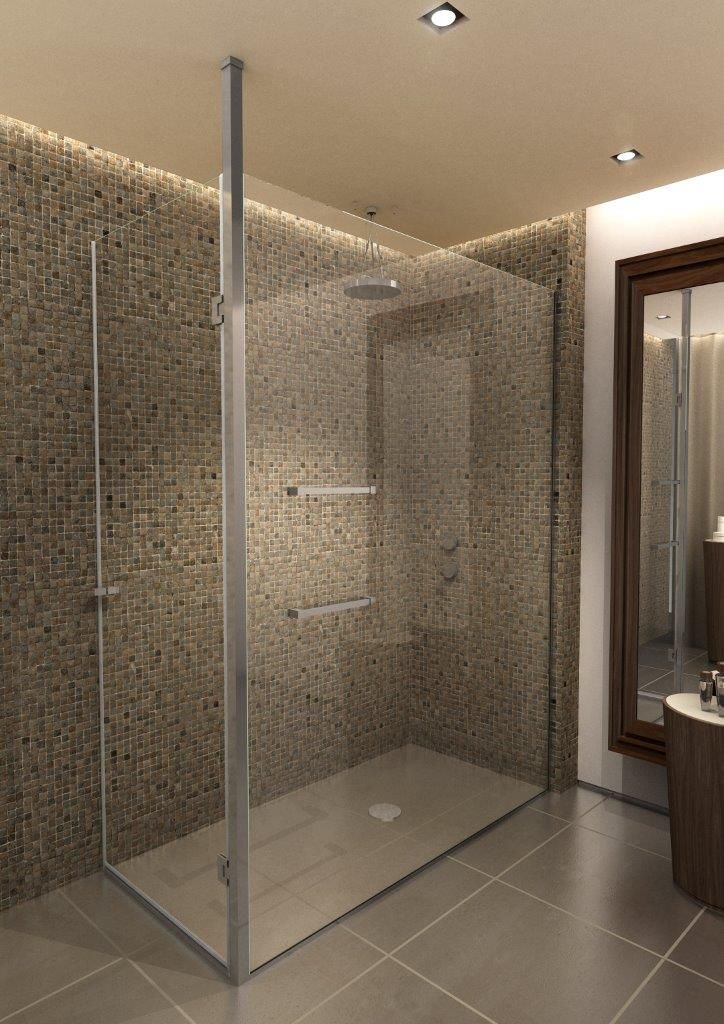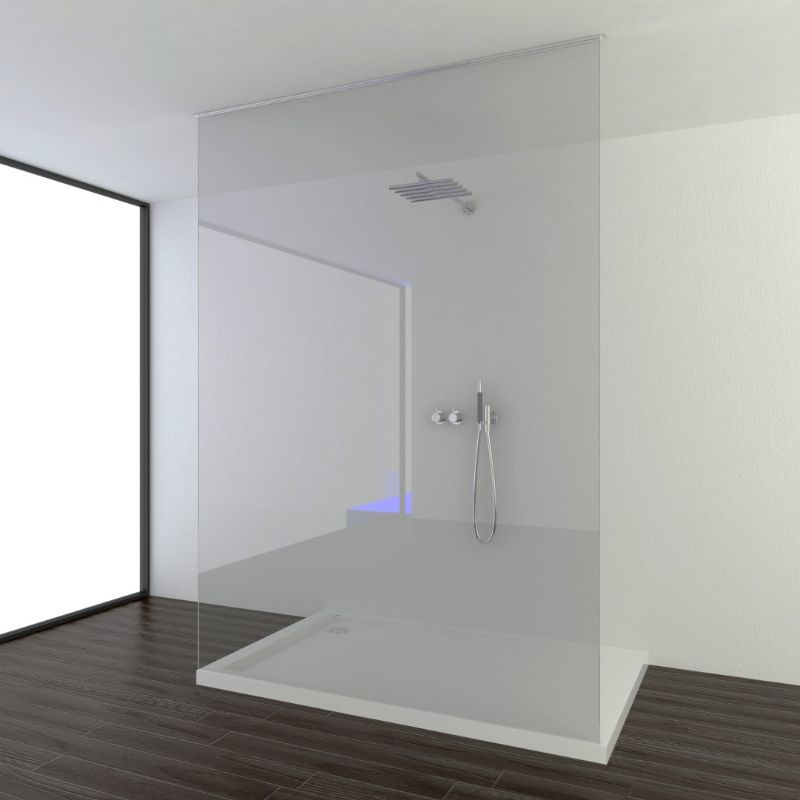 Pour le type ‘douche de plain-pied’, on peut fixer au plafond un panneau vitré totalement indépendant à l'aide de deux profilés chromés carrésVous ne voulez voir que la partie vitrée ? Dans ce cas, un panneau vitré totalement indépendant descend littéralement du plafond (avec un profilé invisible) ou à partir du plafond avec un profilé visible. À la base, la vitre repose simplement sur le receveur de douche ou sur le sol.