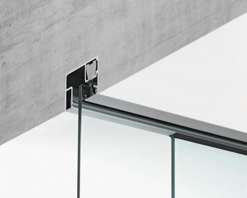 Vous optez pour une combinaison avec un grand panneau latéral vitré avec porte pivotante à 180° qui n'est supportée que par un seul profilé carré ? Dans ce cas, le profilé ressort de la vitre jusqu'au plafond où il est encastré dans une fixation de plafond carrée.