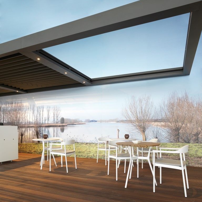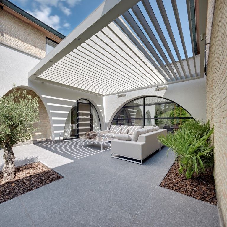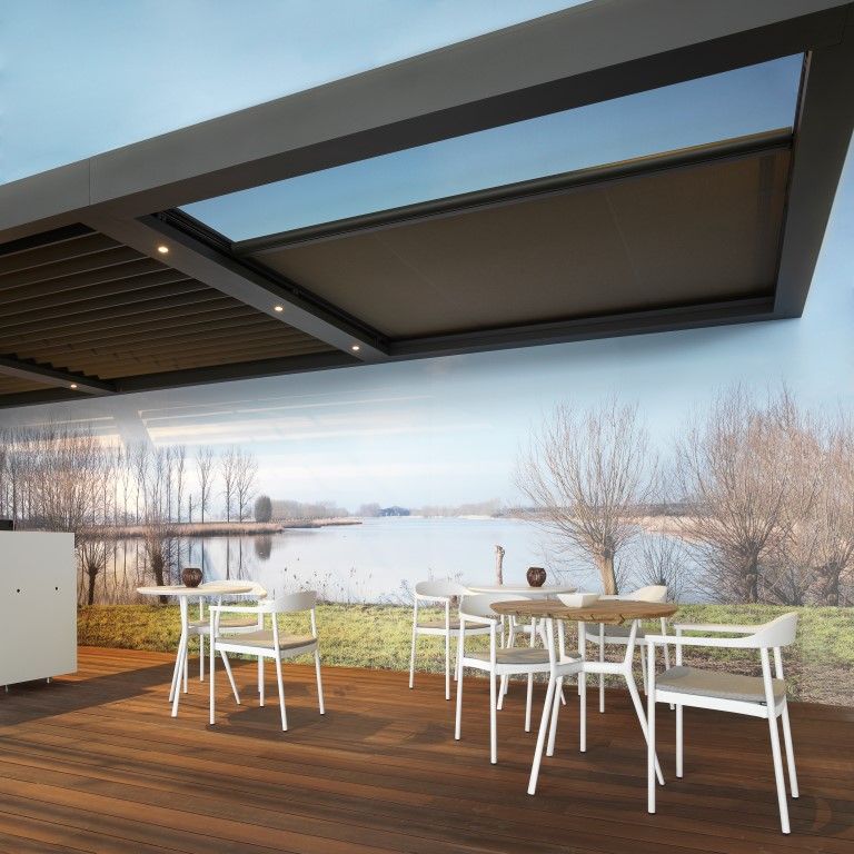 Panno SP, c’est une toiture à lames partiellement à ciel ouvert, pour pouvoir profiter à 100 % des premiers rayons du soleil. Mais bien souvent, il faut tout de même un parasol pour se protéger des fortes chaleurs. En équipant cette partie en plein air d’une toile anti-UV, à savoir le Panno SP d’Umbris, le client choisit une solution élégante adaptée à son architecture. Il est possible de la commander avec le smartphone ou la tablette.