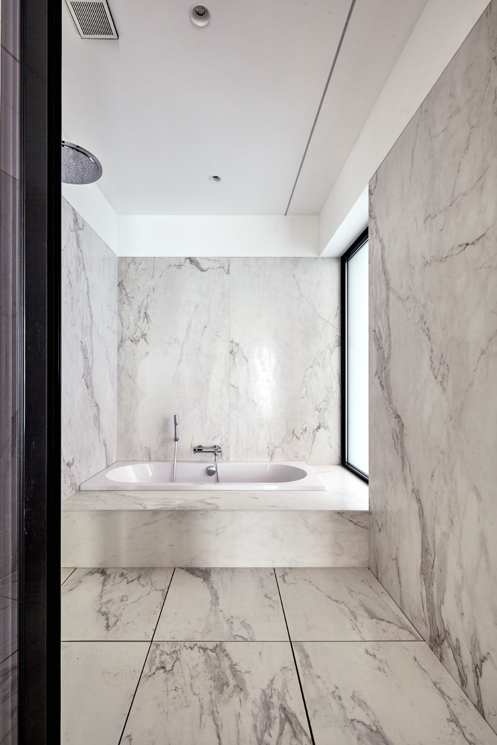 Laissons les architectes évoquer les matériaux choisis et les raison de ce choix : « L’aspect lisse du revêtement de façade en céramique fait écho au grain fin du crépi de la façade arrière de la maison. Les boîtes noires et blanches s’élancent et s’ouvrent largement vers le jardin ou le patio. Le plancher en bois, les moulures et les cheminées d’origine présents dans la partie avant du bâtiment sont conservés et restaurés avec soin afin de mettre en lumière le cachet architectural de la maison bruxelloise. Dans les nouveaux volumes, le choix des matériaux et leur mise en œuvre créent un dialogue entre les éléments d’origine et l’époque actuelle. Au rez-de-chaussée, les éléments de stabilité tels que les colonnes en béton sont laissés à l’état ‘brut de décoffrage’ pour contraster avec un sol coulé en polyuréthane blanc. Afin de rappeler le plancher existant de certaines pièces, un revêtement en bambou composé de lattes très fines a été posé au sol et un revêtement en lattes individuelles en red meranti a été choisi pour les surfaces murales dissimulant la cuisine et les espaces de rangement. Enfin, dans la salle de bain principale, le bain ainsi que la douche semblent avoir été taillés dans le marbre blanc. »