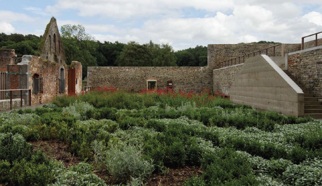 Au terme de la promenade, le visiteur accède à l’ancien Jardin de la Pharmacie des moines où ceux-ci cultivaient une infinité de plantes médicinales. Il a depuis été reconverti en jardin ornemental. Le sol y est, une fois encore, carrossé de béton lavé, un revêtement qui présente à la fois l’avantage d’être suffisamment solide et pérenne pour supporter les déambulations de la cinquantaine de milliers de visiteurs annuels, et esthétiquement cohérent pour se fondre parmi les autres éléments minéraux. Mais ce qui frappe surtout c’est le garde-corps en béton pisé, lequel, outre son rôle fonctionnel, prend des allures de sculpture monumentale. « C’est à ma connaissance, l’une des premières applications en béton pisé en Belgique, en partie parce que l’exécution d’un tel ouvrage est assez complexe : on utilise un ferraillage en inox et on décoffre tout de suite, mais il faut éviter les coulées et faire en sorte que les strates soient suffisamment espacées, soit, dans ce cas, d’environ 70 cm. Nous avons procédé à énormément de tests sur les granulats,notamment pour obtenir les teintes et les dimensions désirées. En effet, selon le type de granulats, après avoir décoffré et nettoyé à l’eau, on obtient presque à chaque fois un résultat différent… », se désespère encore Andrea Tenuta, qui avait une idée bien précise de ce qu’il voulait obtenir comme résultat chromatique. Et il y tenait. « Ça peut sembler beaucoup d’efforts pour rien mais nous avions pu voir des exemples de réalisations en béton pisé en Italie et en Allemagne et nous avions été séduit parl’impression générale : c’était bien du béton mais ça n’en avait pas l’aspect habituel ; il y avait quelque chose de l’ordre d’une vibration qui s’en dégageait. »