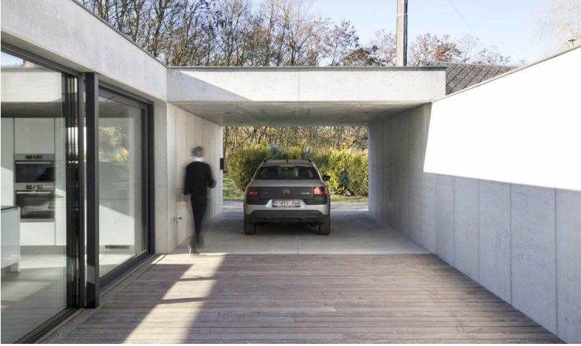 Les propriétaires désiraient d’une part agrandir leur cuisine et, d’autre part, installer un carport tout en se ménageant si possible quelques places de parking supplémentaires. Trois simples volumes de béton ont permis de totalement reconfigurer l’habitation ainsi que les abords en façade avant.