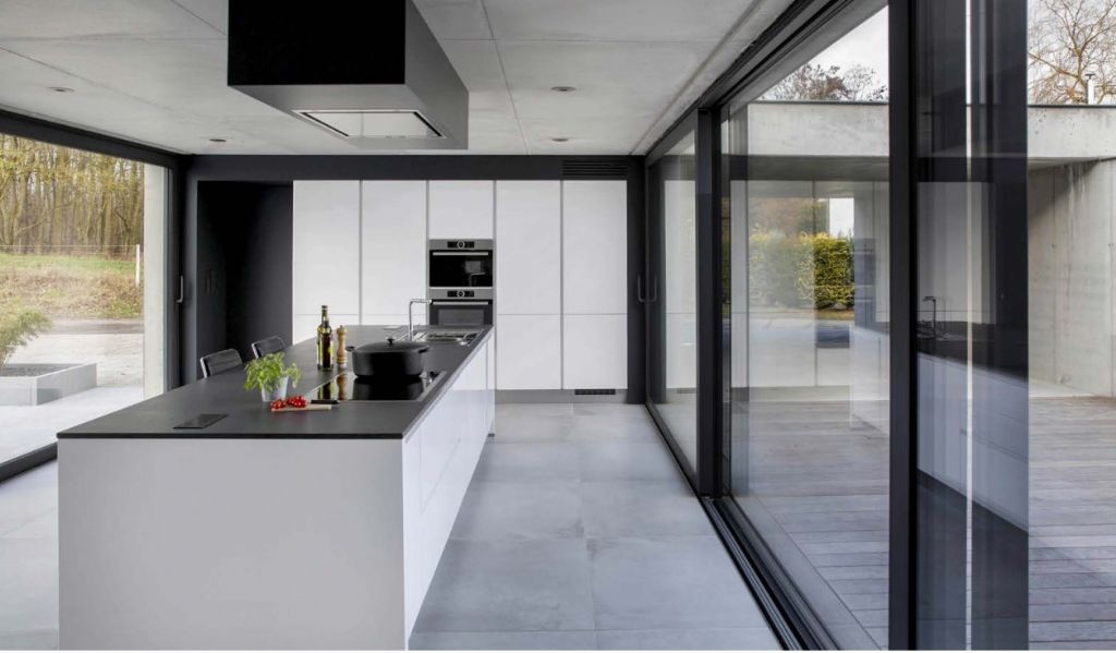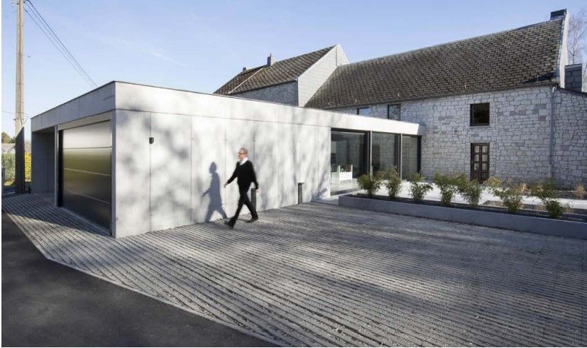 Si cette ancienne ferme offre des volumes généreux, la cuisine, elle, mal enchâssée au milieu de la maison, était particulièrement exiguë et ne bénéficiait que de peu de lumière naturelle. En outre, elle pouvait difficilement être agrandie à son emplacement originel. Il a donc été décidé de créer un nouveau volume en façade avant, dans le prolongement de la salle à manger, où il était possible de bénéficier d’un vaste espace totalement dégagé pour y implanter la cuisine. « Plutôt que d’édifier simplement ce volume supplémentaire, nous avons proposé un projet plus global, à savoir gérer la mitoyenneté en remplaçant la rangée d’épicéas qui marquait la frontière avec l’habitation voisine par un mur de béton érigé dans le prolongement du salon. En y ajoutant le volume destiné à la nouvelle cuisine et en recouvrant l’ensemble d’une dalle, cela a permis tout à la fois de créer une terrasse en bois, d’aménager un « carport » dans le prolongement de celle-ci ainsi qu’un garage fermé dans le même plan que la cuisine. Comme il restait encore un vaste espace non-aménagé en façade avant, à côté de la nouvelle cuisine, nous avons pu y ménager un emplacement extérieur pour voitures en caillebotis et une seconde petite terrasse », explique Pascal Rahier du bureau LRArchitectes, en charge du projet.