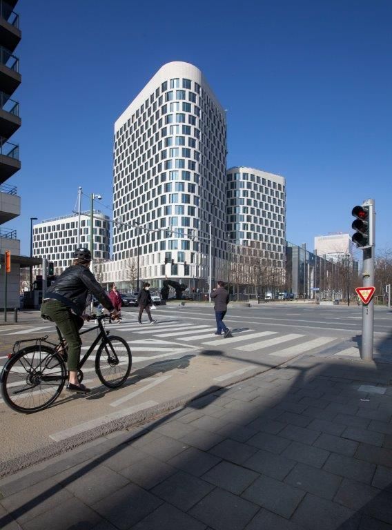 Une fois cette difficile question tranchée, et le choix d'un nouveau bâtiment finalisé, Befimmo s'est tourné vers Jaspers-Eyers Architects. Une décision logique, étant donné que le bureau renommé avait également conçu le Noordbuilding et une foule d'autres complexes de bureaux dans le Quartier Nord bruxellois. C'est ainsi qu'est né Quatuor, un remarquable développement urbain basé sur une conception novatrice. « La priorité numéro un était une meilleure intégration dans le tissu urbain, afin de créer une transition organique entre deux quartiers voisins, mais très différents : le Quartier Nord d'une part, et le centre historique d'autre part », explique John Eyers, CEO de Jaspers-Eyers Architects avec Jean-Michel Jaspers. « Comme le nom du projet le suggère, l'immeuble Quatuor se compose de quatre tours compactes de différentes hauteurs : le bloc A compte cinq étages (8031 m2), le bloc B neuf étages (11 744 m2), le bloc C quatorze étages (18 742 m2) et le bloc D dix-huit étages (22 717 m2). La hauteur des tours est adaptée aux caractéristiques de l'environnement. Les volumes les plus hauts font le lien avec les immeubles de bureaux voisins le long de l'avenue Albert II et du Ring intérieur, tandis que les tours plus basses cherchent à se connecter aux plus petits développements résidentiels du côté du centre-ville. Tous reposent sur une base commune de quatre étages, ce qui crée un ensemble cohérent. »