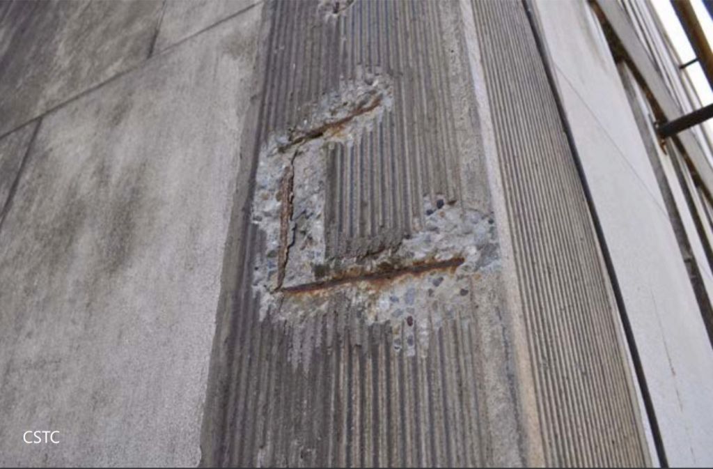 Les réactions de corrosion apparaissant à la suite d’une carbonatation du béton constituent l’une des pathologies le plus fréquemment rencontrées sur les édifices en béton armé (voir photo ci-dessous). Elles produisent des dégradations (fissures, éclats, délamination, …) que l’on traite généralement au moyen d’un mortier de réparation. Bien souvent, un revêtement de protection (coating) est également appliqué en surface, afin de :