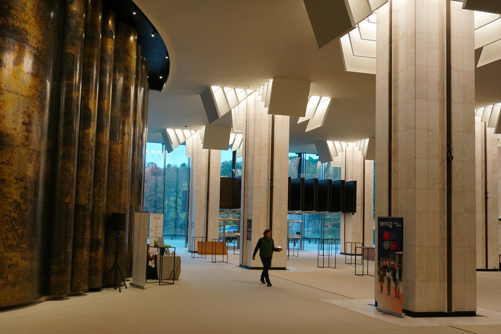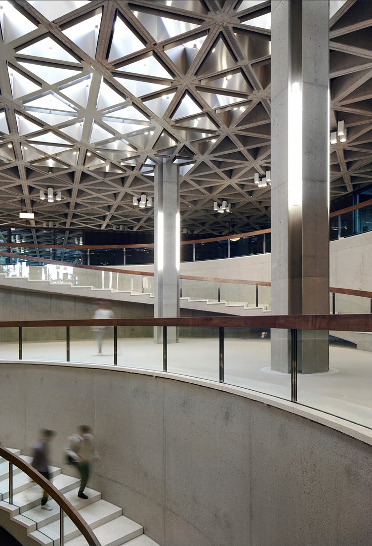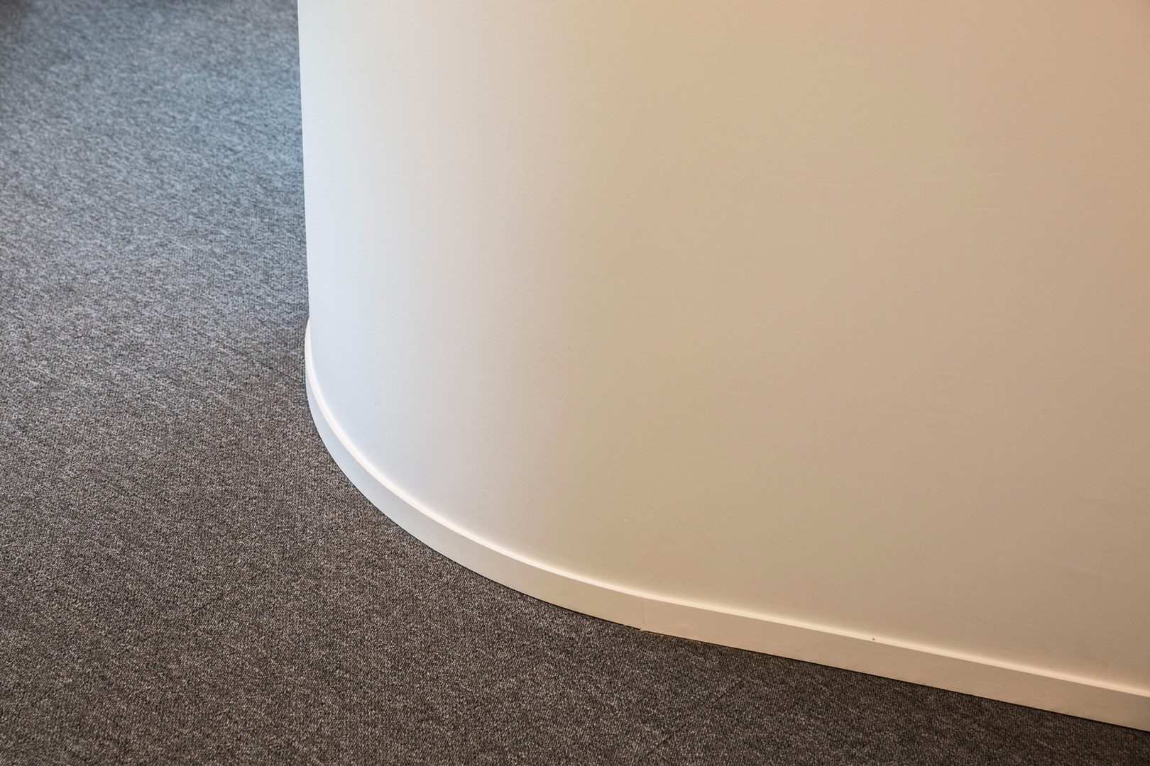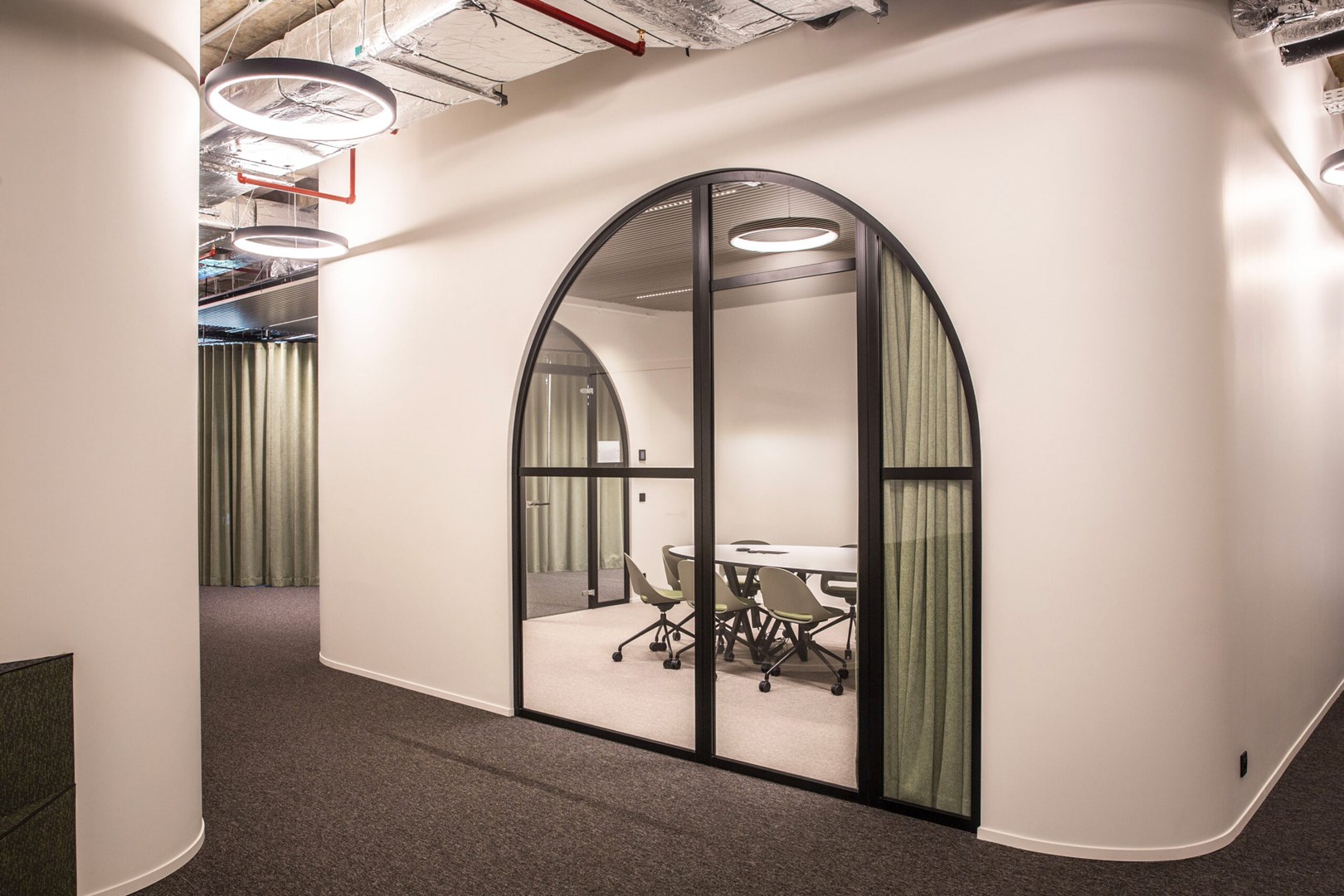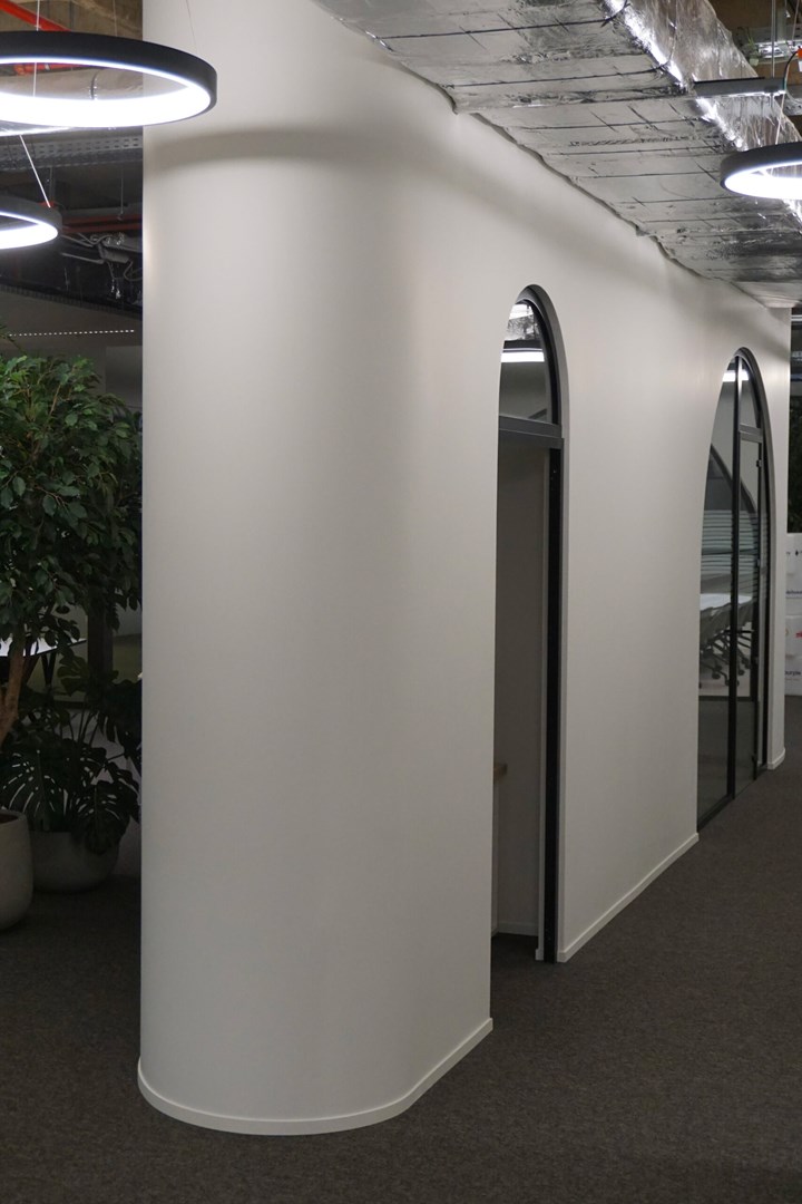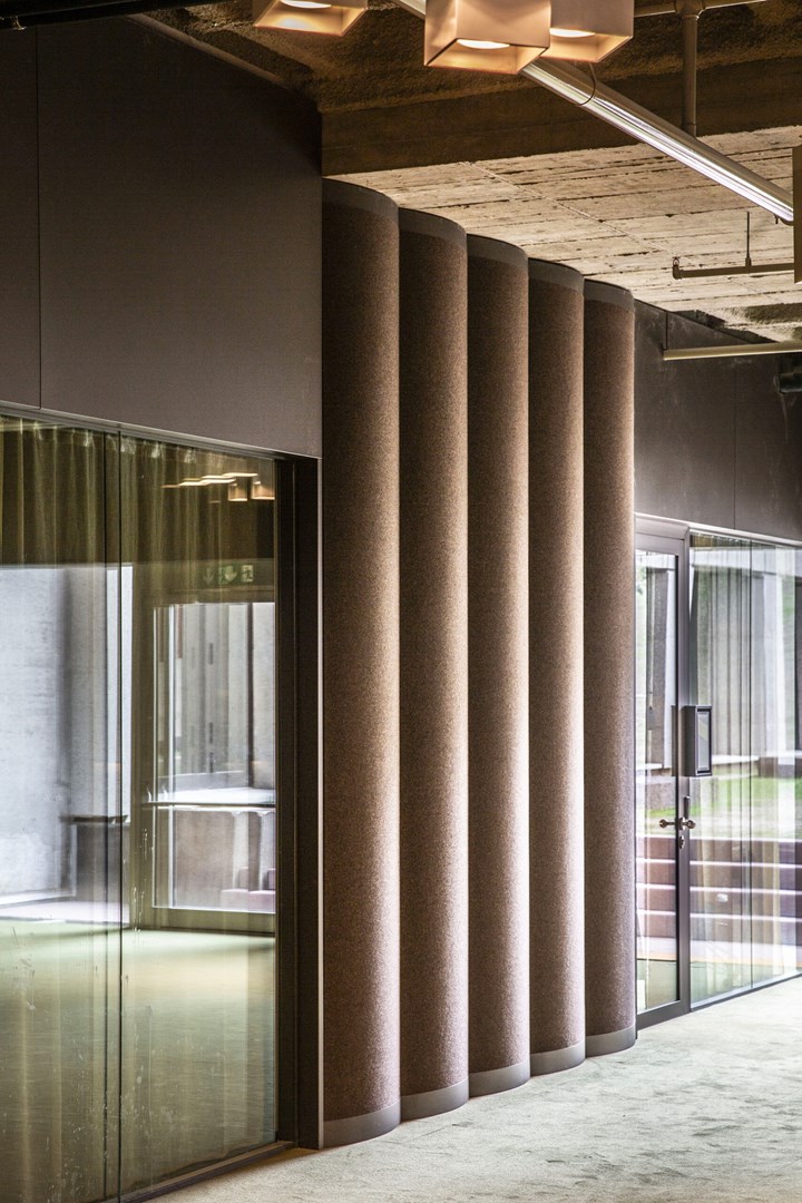 L’atrium fut l’un des éléments les plus complexes tant sur le plan technique qu’esthétique. Des plafonds acoustiques perforés y ont été intégrés dans la structure en béton existante via le concept GypArt®. Les parois courbes du restaurant et de l’espace de coworking, habillées de textile Kvadrat et finies avec des plinthes en aluminium, ont nécessité un travail sur mesure d’une grande précision. Des angles GRG courbes (plâtre renforcé de fibre de verre) ont donné forme à ces éléments intérieurs sculpturaux.