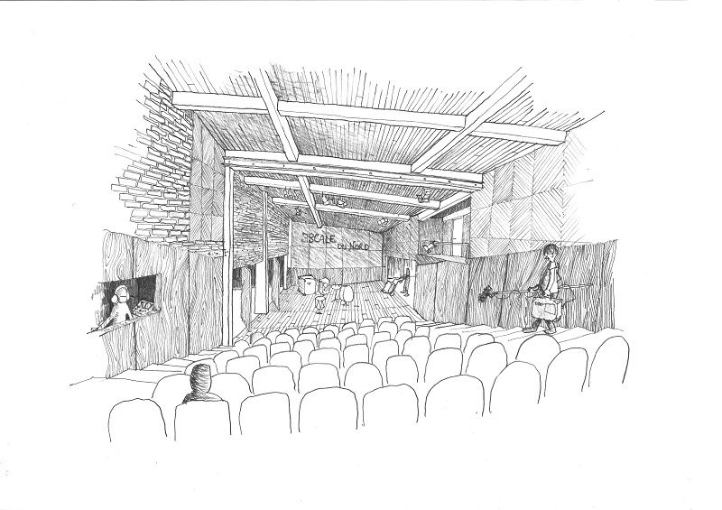 Le projet permet des interactions avec le parc et la réouverture de vue sur cet espace public. Les diverses entrées permettent de s’adapter à une évolution programmatique du centre culturel. Les salles dédiées à l’accueil du public sont autonomes et peuvent s’ouvrir les unes sur les autres permettant une exploitation polyvalente des espaces en fonction des réels besoins de chaque activité. Les jeux de volumes existant sont conservés dans le foyer. Un contraste est établi entre ancien et nouveau : les nouveaux gradins et le bar en multiplex s’insèrent dans les finitions brutes apparentes des structures en béton existantes, cela valorise l’aspect originel du bâtiment. Les circulations du bâtiment sont repensées et clarifiées. Un nouveau volume loge l’escalier dédié au public tandis qu’un escalier existant est maintenu pour relier les espaces servants.