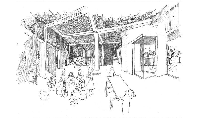 La mission consistait en la rénovation et l’augmentation de capacité d’un centre culturel. Le projet s’inscrit dans le cadre du contrat de quartier Scheut à Anderlecht. Ce programme est l’opportunité de créer le projet « phare » pour le quartier. Situé en intérieur d’îlot et ouvert sur un parc, le projet se devait d’activer l’espace public. Le marché comprend : la conception d’une salle de spectacle avec régie, des ateliers, des bureaux, et un foyer. Le bâtiment doit atteindre les standards basse énergie.
