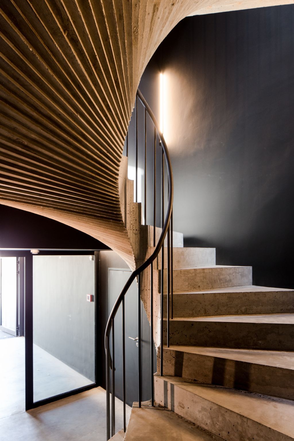 Les larges baies vitrées cadrent les vues sur le contexte à la manière de tableaux et participent à l’intégration du projet dans son contexte grâce à l’interaction créée entre les activités du bureau et la vie du quartier. Un jeu volumétrique simple définit le gabarit des volumes qui s’articulent avec le contexte. L’impact du projet est ainsi minimisé en maintenant un gabarit à l’échelle du bâti environnant. Les façades sobres adoptent un langage architectural lisse et sans ornement, tout en répondant généreusement au besoin fondamental de lumière naturelle.