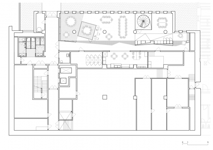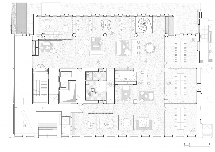 - Tous les nouveaux espaces de travail flexibles sont constitués de meubles fabriqués à partir de meubles existants démontés, et complétés par des éléments provenant d'autres sites. La cuisine a également été récupérée et relookée avec des matériaux récupérés ailleurs, tout comme le nouveau podium, les nouveaux bancs et les équipements d'éclairage ;