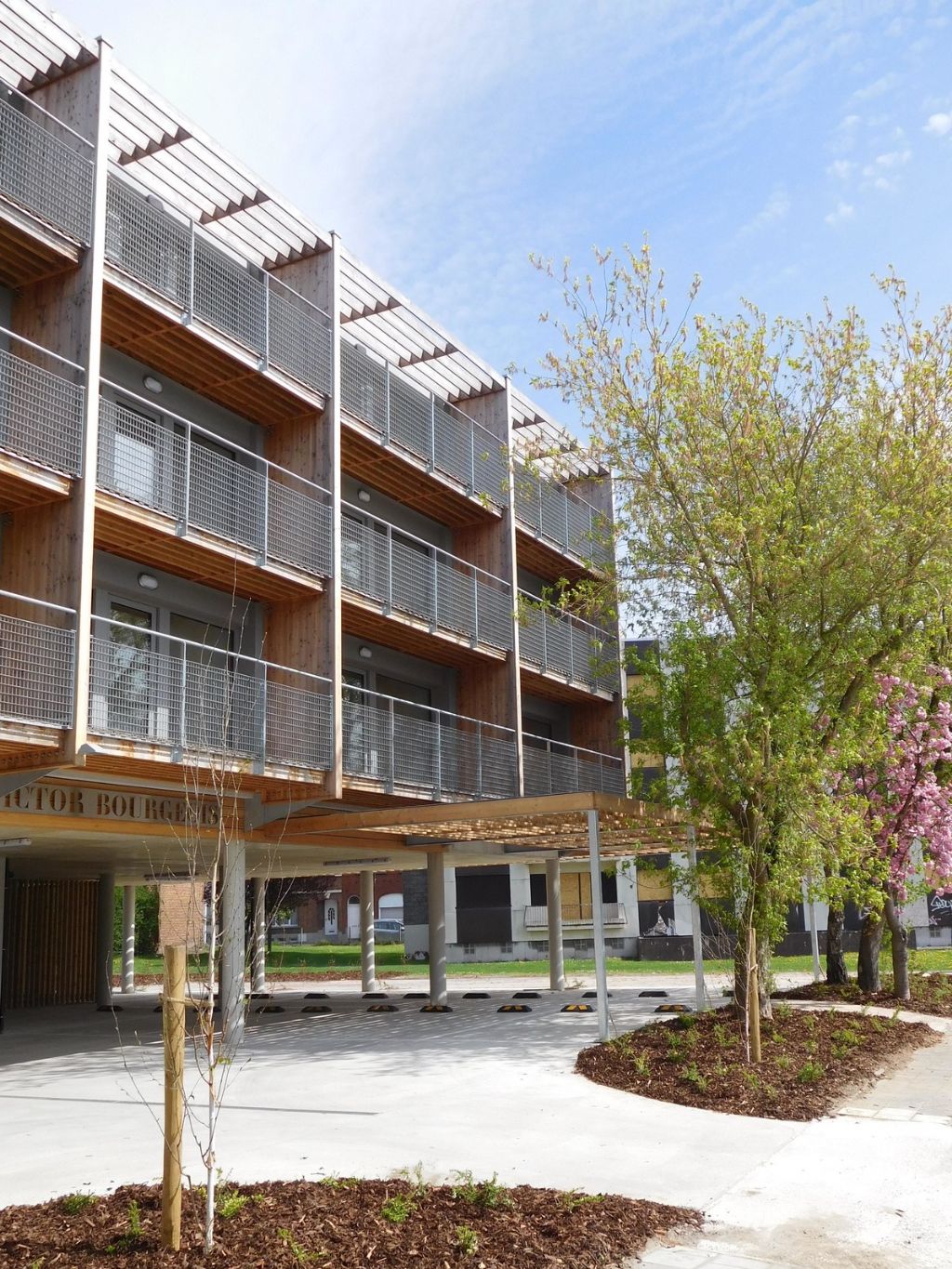 L'aménagement des abords (place, jardin pédagogique et jardins partagés, locaux communs pour le tri sélectif …) est conçu de manière à privilégier des espaces de rencontre, à favoriser les contacts entre les habitants et à augmenter la cohésion sociale. L'espace couvert sous pilotis, situé sous le nouveau bâtiment passif, pourra être utilisé pour l'organisation d'activités diverses et de loisirs (fête des quartiers, brocante…).