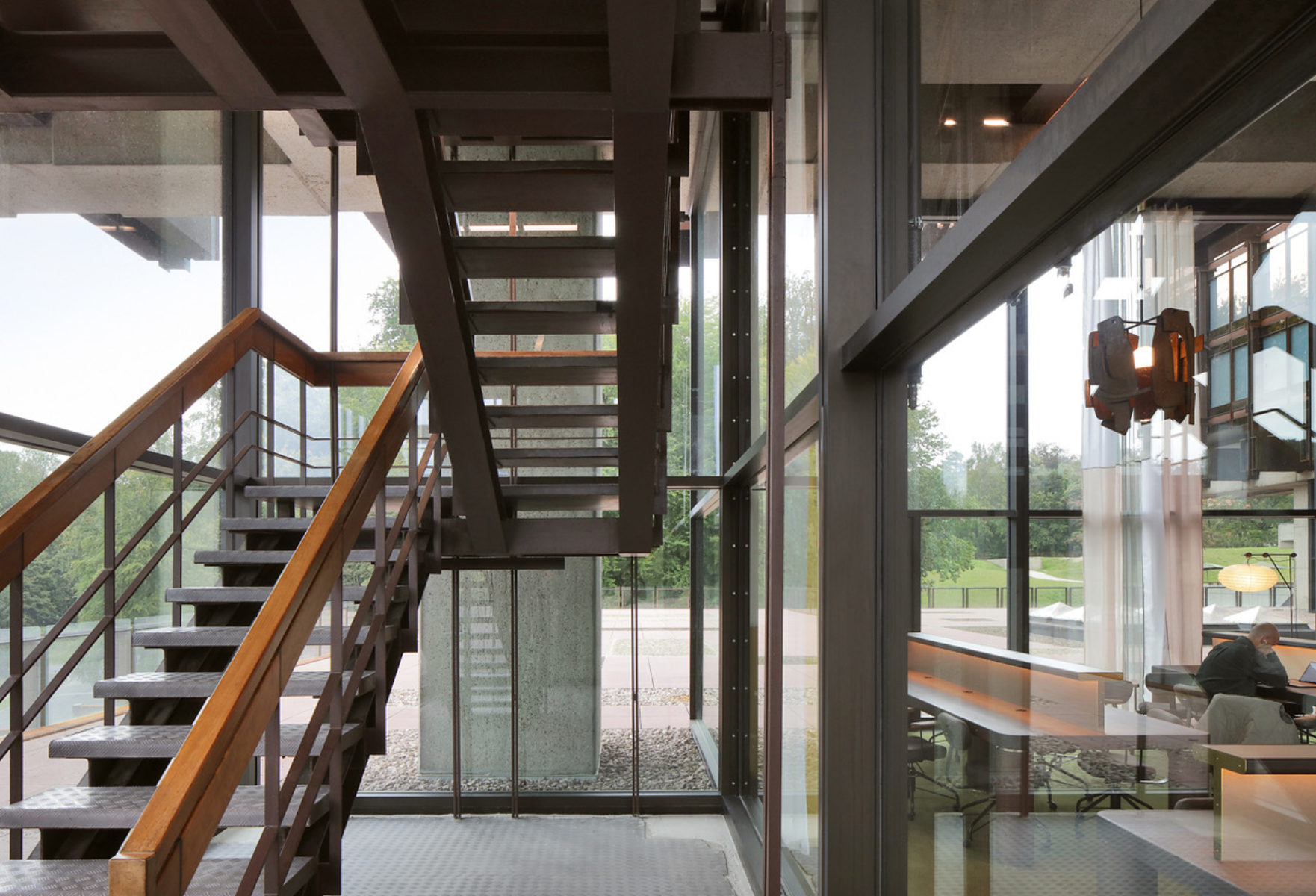 Proposant un restaurant, un espace de coworking, un hôtel, un auditorium, un espace sportif et des bureaux, le programme mixte facilite la réintégration du bâtiment dans la vie et le tissu urbain bruxellois. Afin d’en optimiser l’accessibilité et l’usage, un nouveau hall vertical est créé entre le rez-de-chaussée et le niveau 2 à la jonction des espaces partagés. Dessiné à l'image de l'auditorium dans sa forme et ses proportions, ce nouveau noyau de circulation permet d’apporter de la lumière dans une partie sombre du bâtiment et crée une connexion entre le socle de verre (0 et +1) à la tour cruciforme (+2 à +10). Le projet réhabilite ce bâtiment et en améliore la performance énergétique par des interventions spécifiques et réfléchies et offre une opportunité d’insuffler une nouvelle vie à l’ensemble du site.